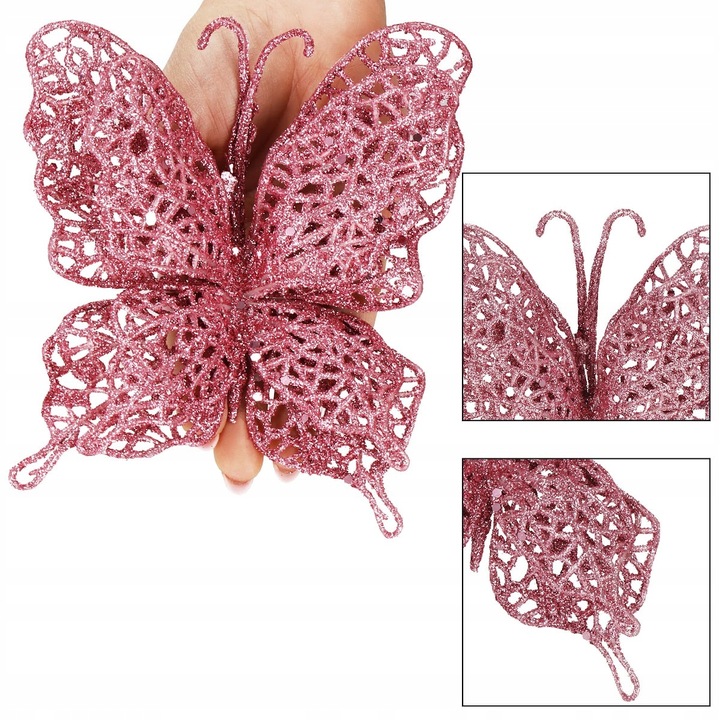 Adauga un plus de eleganta decorului de sarbatoare cu acest set de 10 ornamente pentru brad in forma de fluture roz cu sclipici. Designul delicat si stralucitor transforma instant pomul de Craciun, coronitele sau aranjamentele festive intr-un decor vesel, rafinat si plin de farmec.