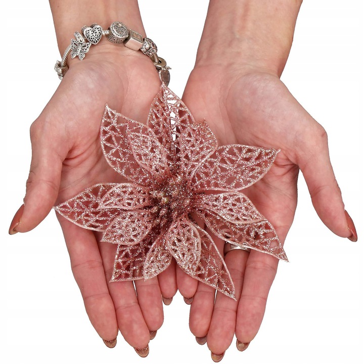 Adauga un plus de farmec sarbatorilor cu acest set de 10 ornamente pentru brad in forma de Poinsettia roz, inspirate de floarea simbol a Craciunului. Designul elegant, cu petale decupate si finisaj stralucitor, ofera un efect vizual deosebit in bradul de Craciun, pe ghirlande, coronite sau in aranjamente festive de masa.