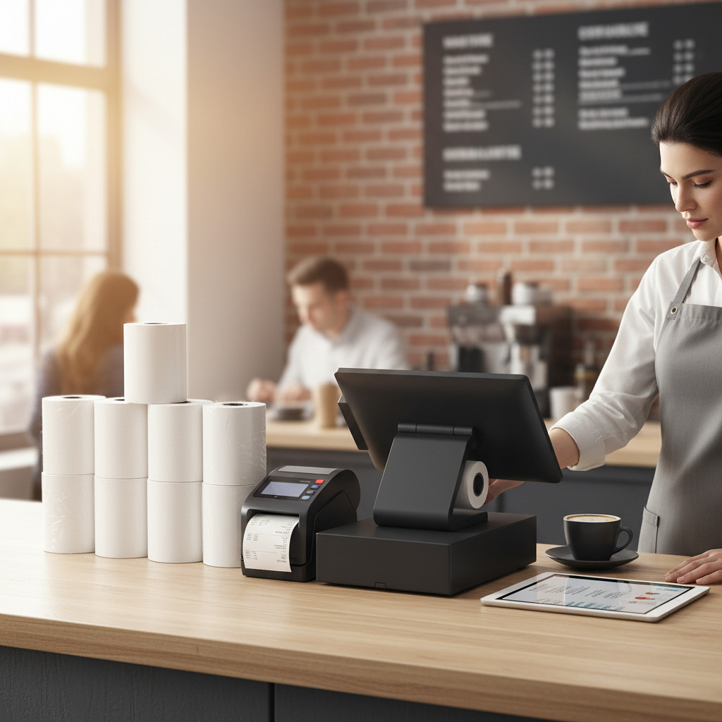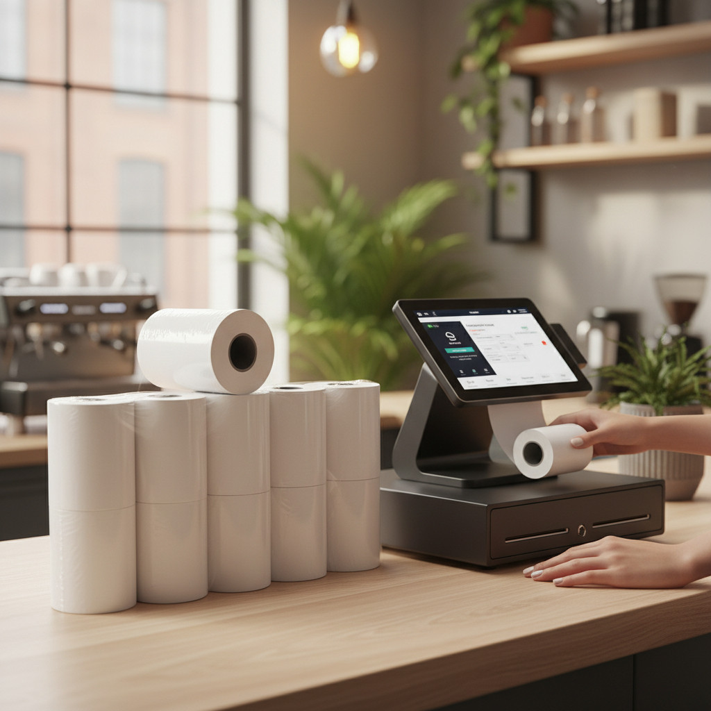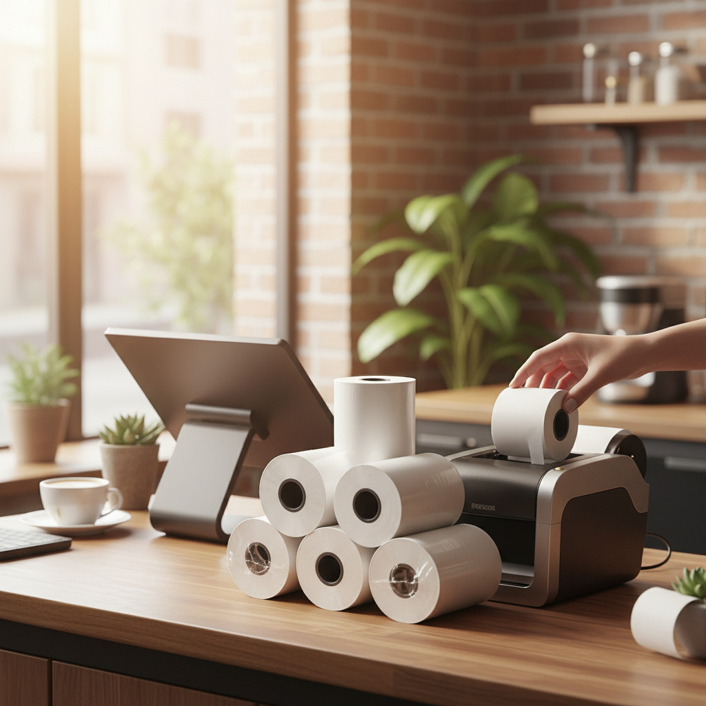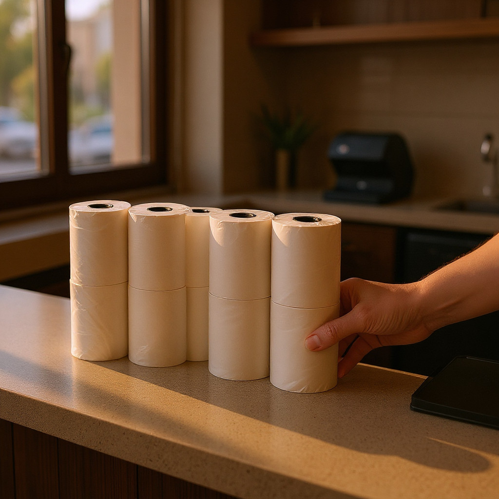 Utilizare: deschide capacul imprimantei/casei de marcat, introdu rola cu partea termică orientată corect, trage puțin hârtia și închide capacul. Pentru rezultate optime, păstrează rolele ferite de căldură, lumină directă și umiditate.