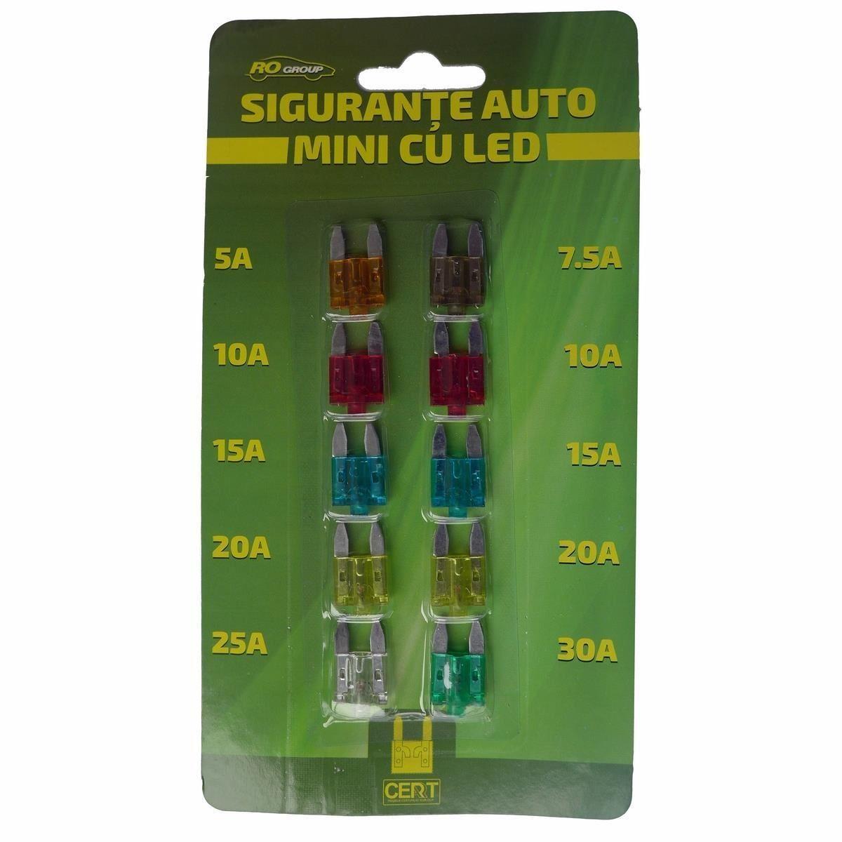 Set 10 sigurante auto mini cu LED RoGroup 12V pentru protectie electrica