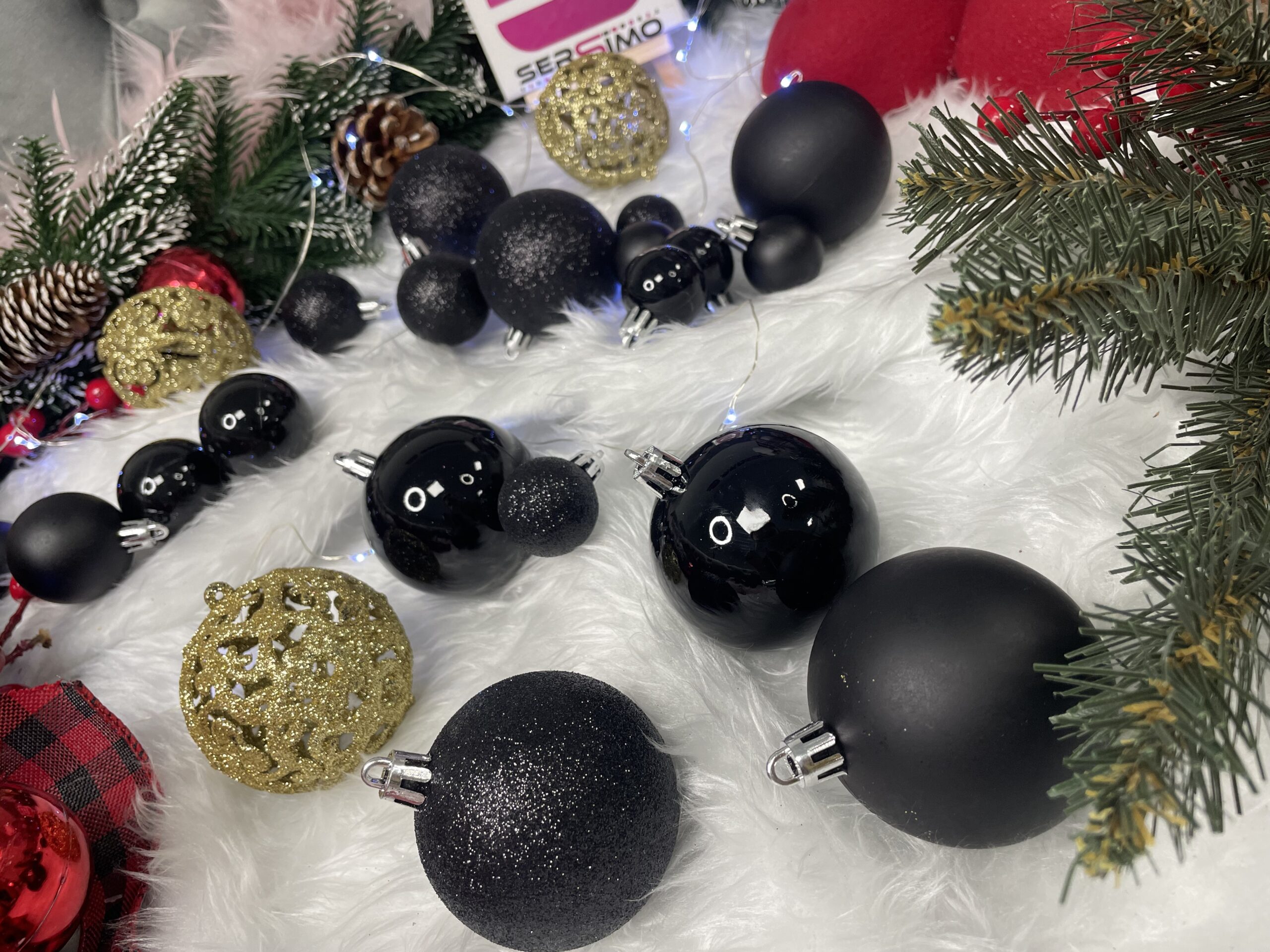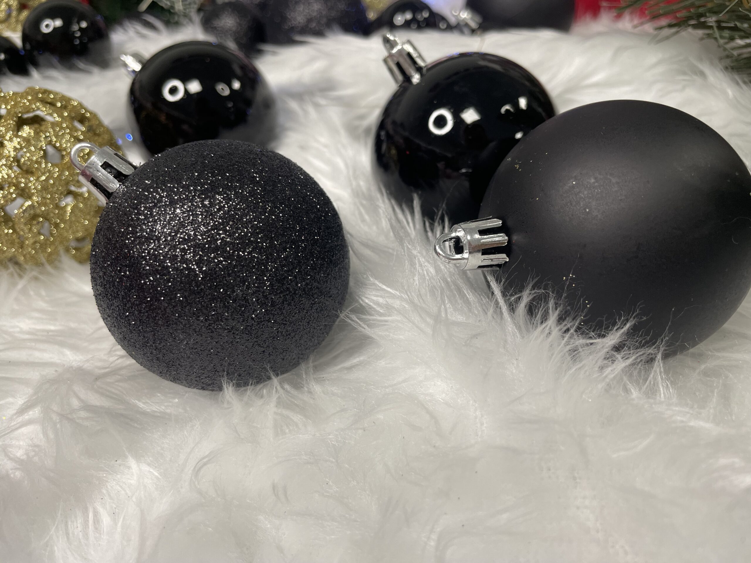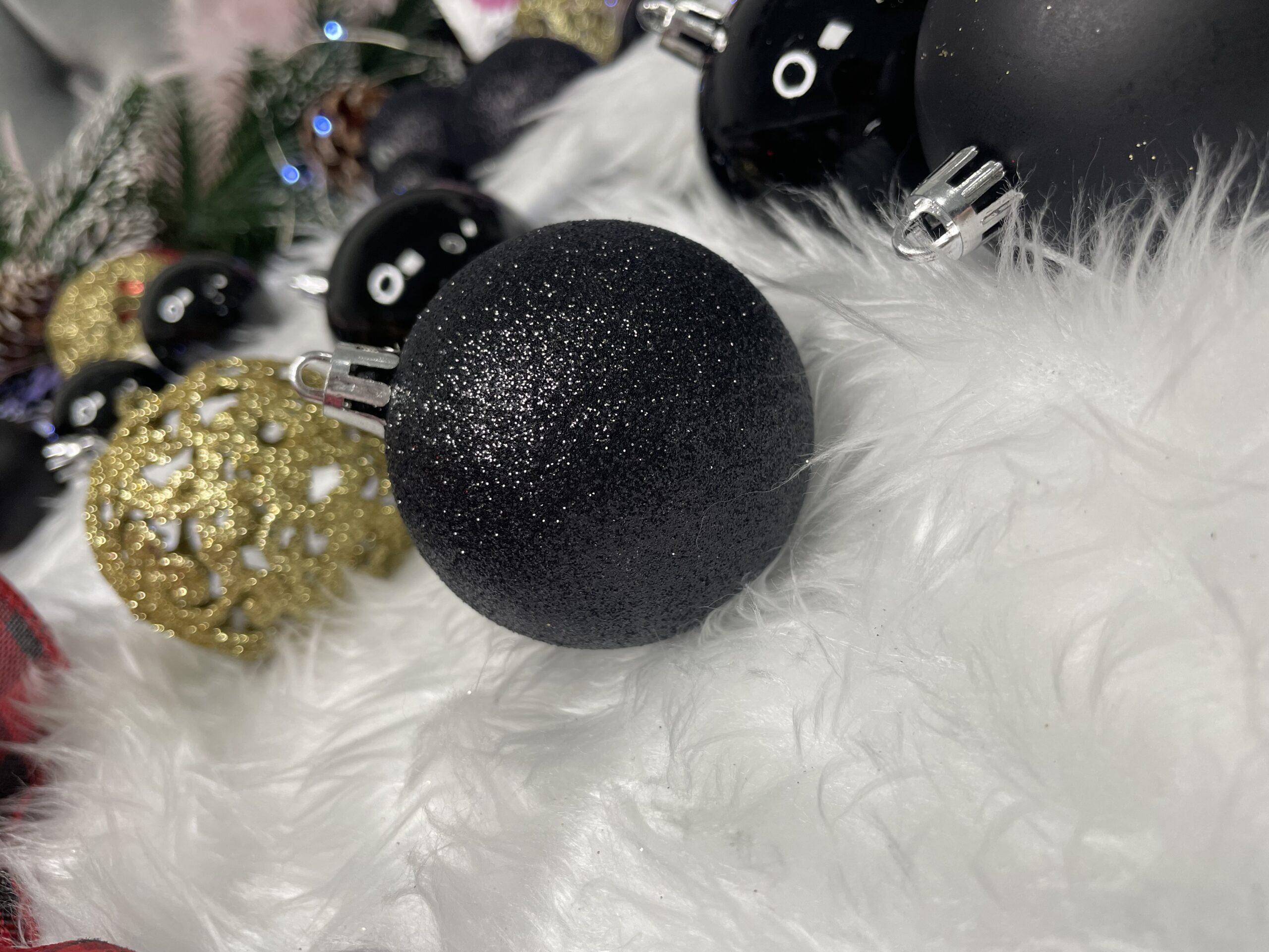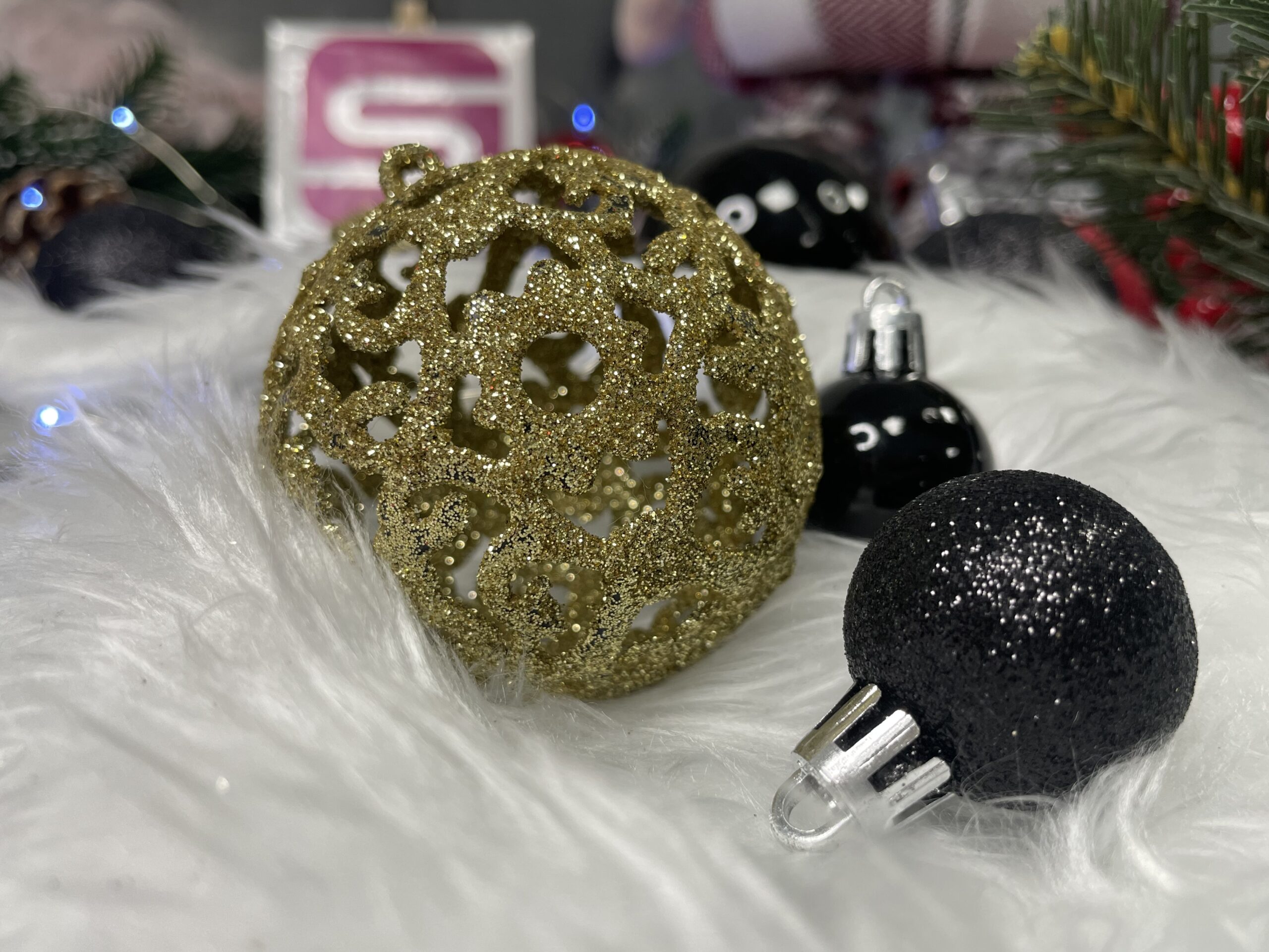 Set 100 globuri de Craciun negre si aurii, 3-6 cm, din plastic