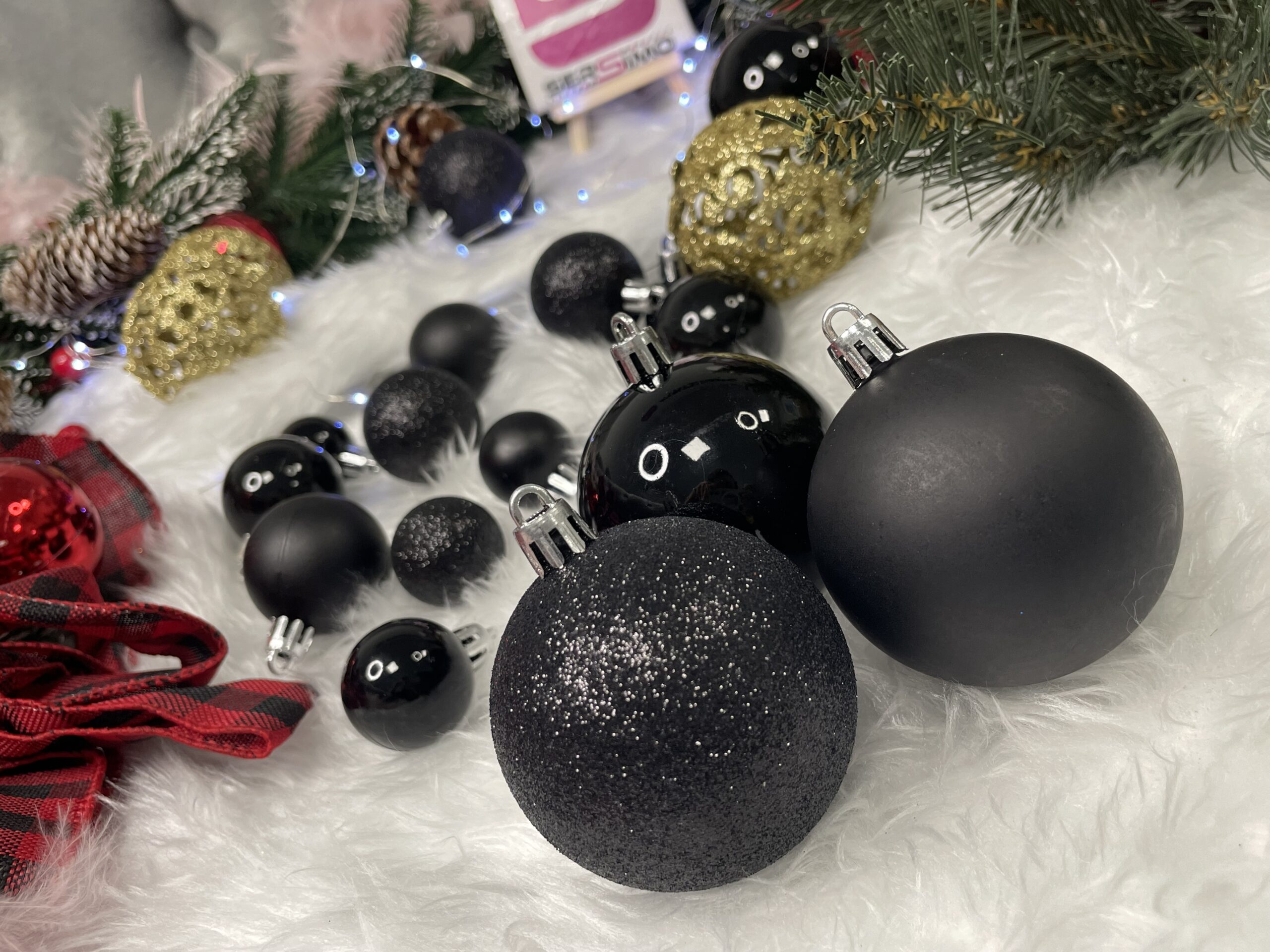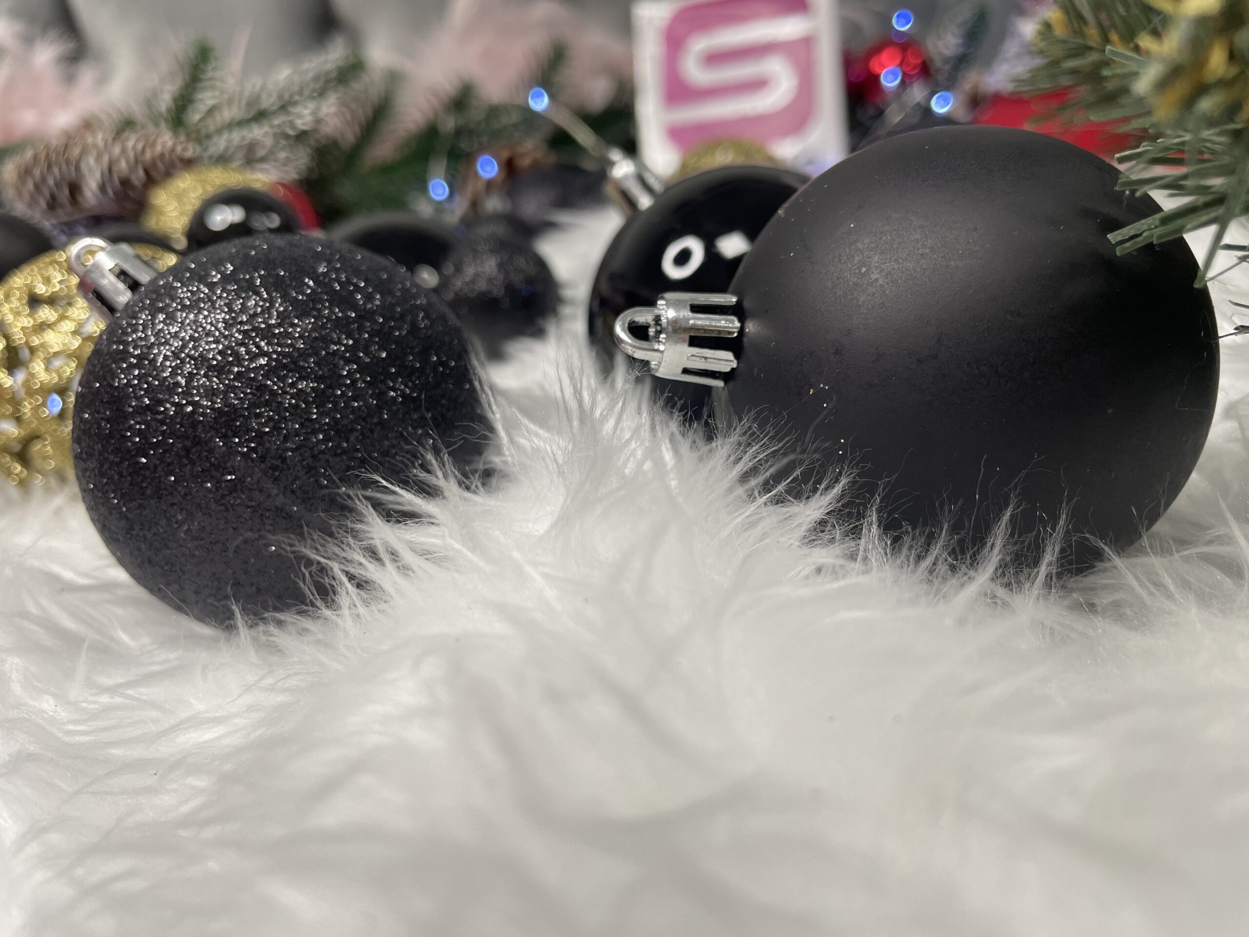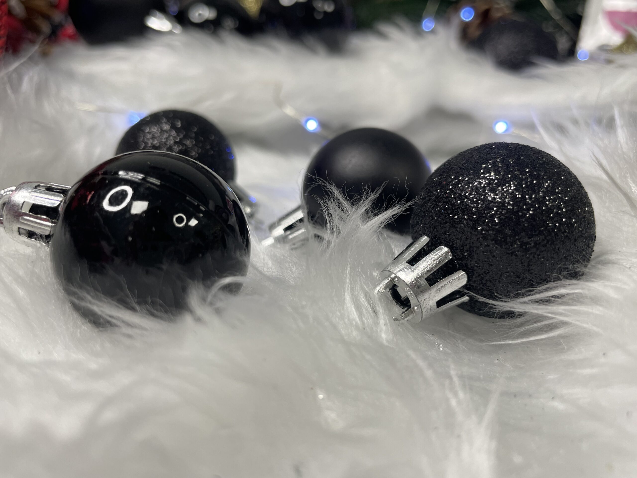 Set 100 globuri de Craciun negre si aurii, 3-6 cm, din plastic