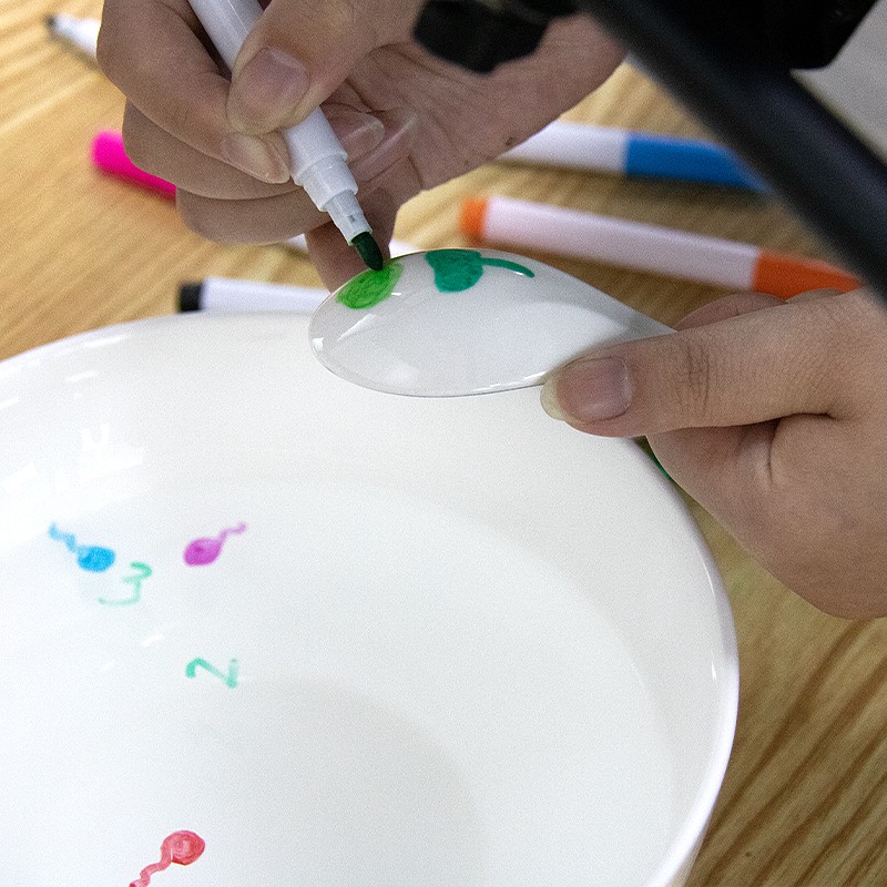 Desenele plutitoare pe apa sunt posibile urmand cativa pasi: primul pas este stergerea linguritei ceramice cu un servetel, apoi copilul poate desena modelul dorit pe lingurita, iar dupa cateva secunde de asteptare pentru ca modelul sa se usuce, aceasta se pune in bolul cu apa rece, iar desenul se va transfera pe suprafata apei.