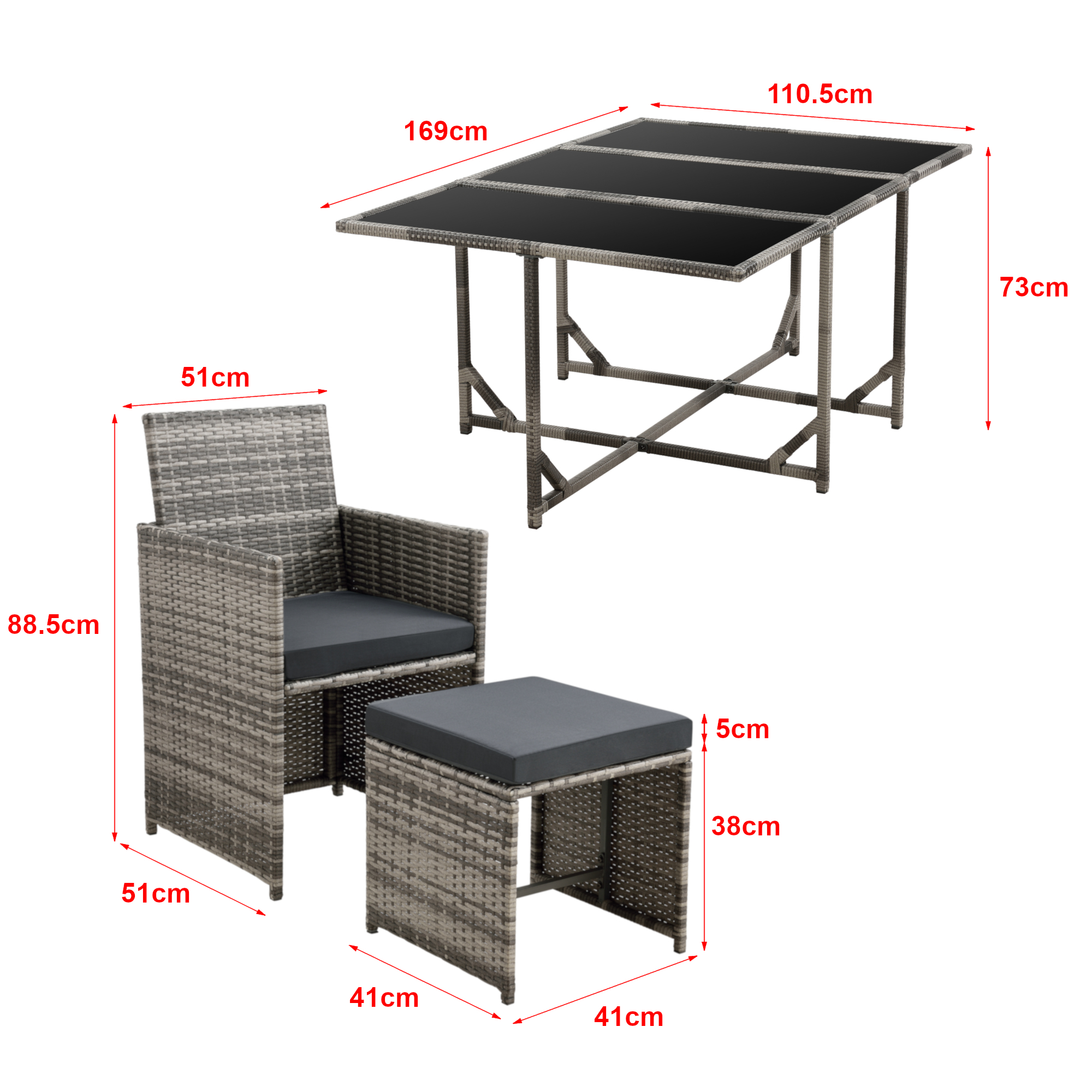 Setul estetic mobilier gradina este format din: 1 masa, 6 fotolii si 4 scaune puff. Este perfect pentru atunci cand doriti sa va relaxati in gradina sau pe terasa. Fotoliile si scaunele pot fi depozitate sub masa, astfel intregul set poate fi depozitat cu economie de spatiu atunci cand nu-l folositi.