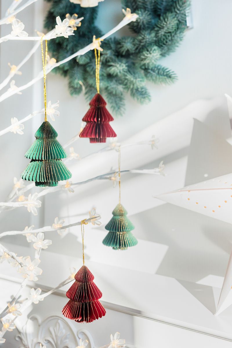 Setul de decorațiuni pentru brad din hârtie tip fagure aduce un plus de farmec și eleganță decorului de sărbători. Aceste ornamente în formă de brăduț impresionează prin designul lor pliabil, cu efect 3D, fiind ideale pentru un decor festiv cald, rafinat și ușor de asortat în orice locuință.