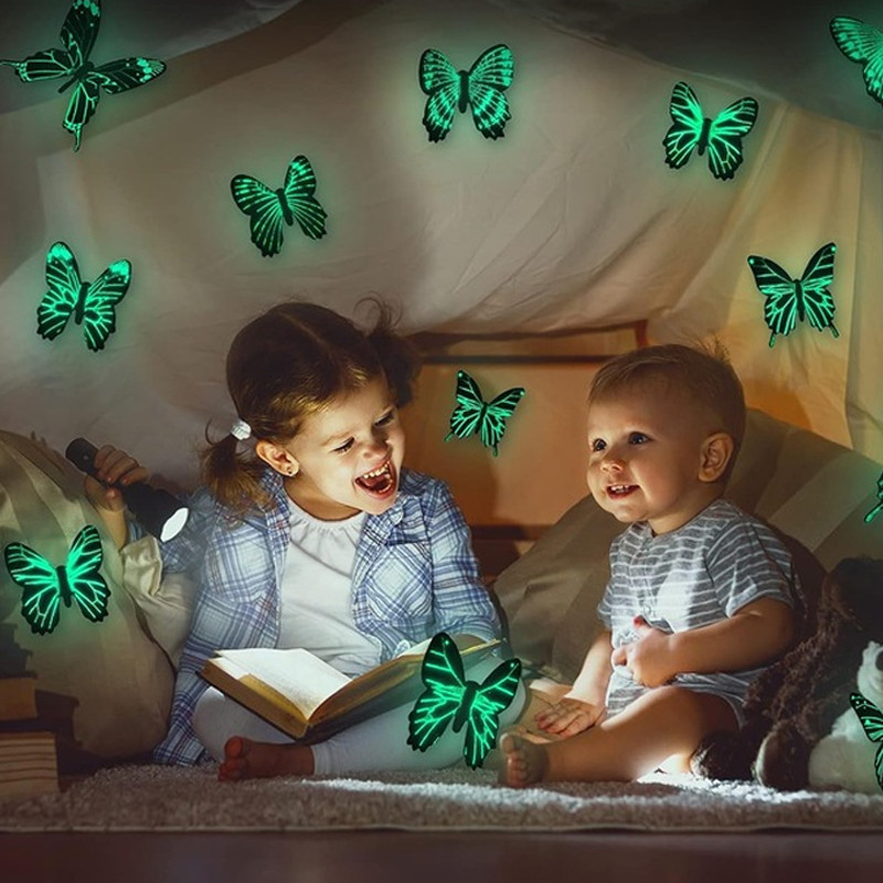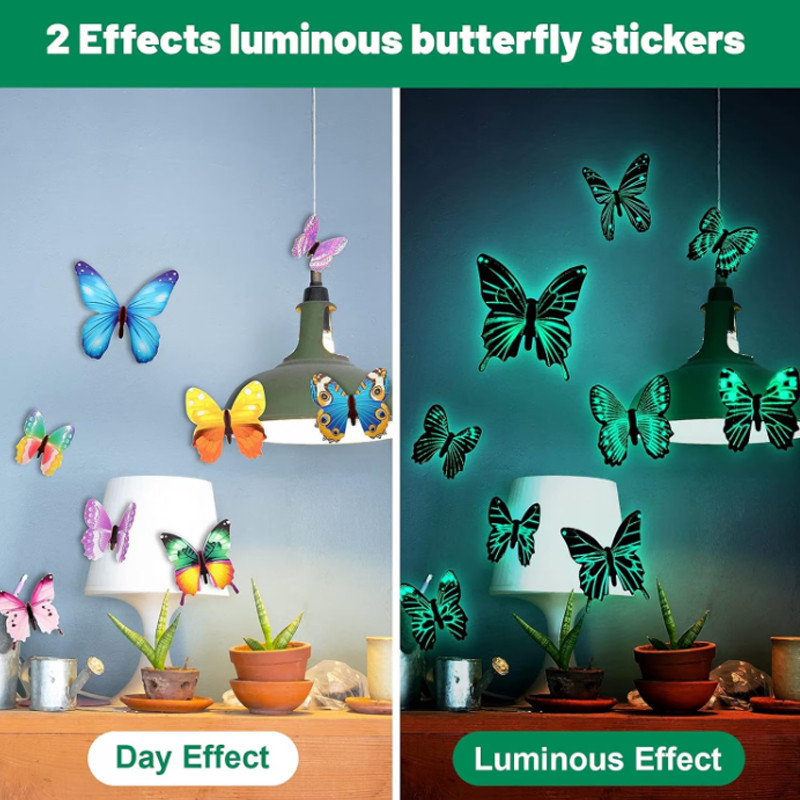 Descriere Set 12 fluturi decorativi 3d, fosforescenti,