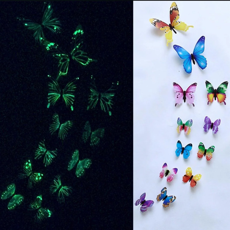 Descriere Set 12 fluturi decorativi 3d, fosforescenti,