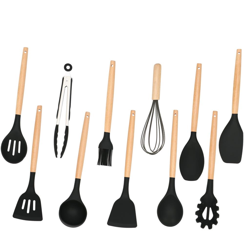 Set 12 ustensile de bucătărie din silicon termorezistent cu bambus, negru