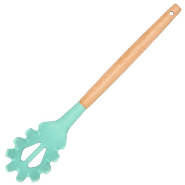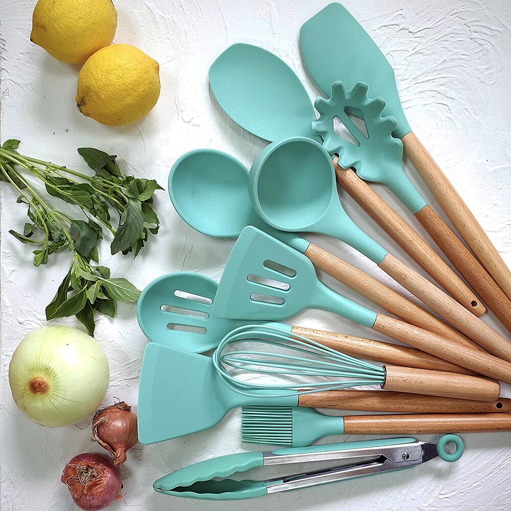 Set 12 ustensile de bucătărie din silicon termorezistent cu bambus, verde