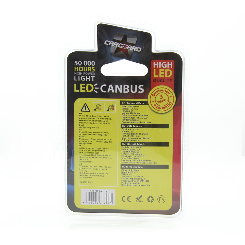 Upgrade rapid pentru iluminarea mașinii: setul de becuri LED sofit 31mm CAN116 este ideal pentru plafonieră și iluminarea numărului de înmatriculare. Cu lumină alb rece 6000K și tehnologie CANBUS, obții un aspect modern și o vizibilitate mai bună, cu risc redus de erori în bord la multe modele auto.