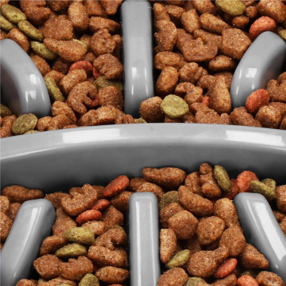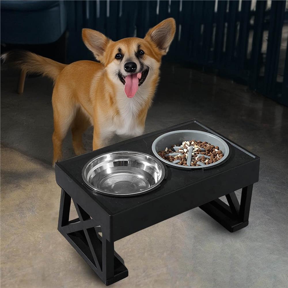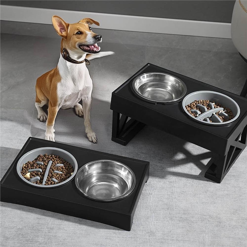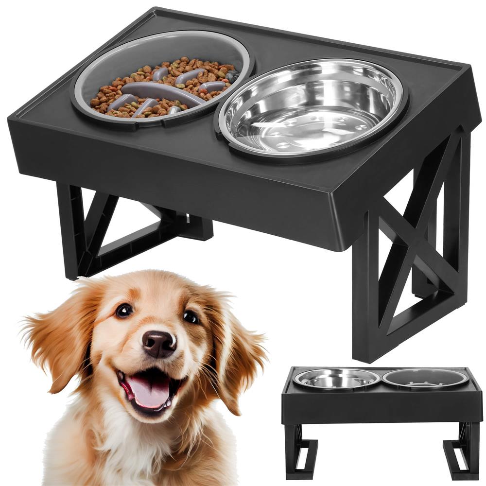 Material: otel inoxidabil, plastic Culoare: negru, gri, argintiu Lungime totala: 43,5 cm Latime totala: 26,5 cm Inaltime totala: 8,5 cm Vas din otel, diametru 19,5 cm; inaltime 6 cm Diametru deschidere bol: 21 cm Stand cu picioarele desfacute: inaltime 21 cm; 21 - 27 cm Distanta dintre picioare: 43 si 19,5 cm 2x picior: 25 x 19 x 2 cm Cainele tau merita cel mai inalt nivel de confort si distractie! Bolurile pentru mancare si apa pe un suport reglabil sunt o solutie inovatoare care ofera cainelui tau nu numai bucurie , ci si beneficii pentru sanatate. Produs 2 in 1 - bol alimentar + bol cu apa Un suport care va permite sa reglati inaltimea bolurilor Bolul pentru mancare are proeminente - incetineste ritmul de mancare si incurajeaza mestecatul Are un efect de promovare a sanatatii asupra corpului cainelui Stimuleaza instinctele naturale de urmarire Reduce riscul de flatulenta, varsaturi si proasta dispozitie la animalele de companie Ajuta la relaxare si reduce stresul la cainele tau Sprijina curatarea dintilor Previne formarea tartrului Fabricat din materiale sigure si durabile Usor de curatat si pastrat curat Stabil in timpul utilizarii De asemenea, grozav pentru o pisica Bolul de mancare pentru caini are un alt beneficiu uimitor - ajuta la incetinirea hranirii si la reducerea stresului. Datorita designului si structurii speciale a bolului, cainele trebuie sa munceasca un pic mai mult pentru a ajunge la rasfat. Acest lucru face ca mancarea sa dureze mai mult, ceea ce este benefic pentru cainii care au tendinta de a inghiti mancarea intreaga. In plus, bolurile lente ii ofera cainelui dvs. un plus de activitate si concentrare, ceea ce ajuta la reducerea stresului si a anxietatii. uteti scoate cu usurinta bolurile pentru mancare si apa din suport si le puteti pune la loc, asa ca spalarea si pastrarea lor curata nu este o problema! Bolurile noastre pentru caini sunt echipate cu un suport unic reglabil care asigura stabilitate in timpul consumului de alimente. Suportul va permite sa plasati boluri la trei inaltimi : Pentru caini si pisici de talie mica - pliati complet picioarele, astfel incat baza bolurilor sa se afle pe podea - inaltimea sa este atunci de 8,5 cm. Pentru caini de talie medie - desfaceti picioarele suportului astfel incat baza sa se afle orizontal pe ele la o inaltime de 21 cm. Pentru caini mai mari - intindere picioarele suportului astfel incat baza sa fie in unghi, apoi castronele vor fi si mai sus si intregul stand va ajunge la o inaltime de 27 cm.