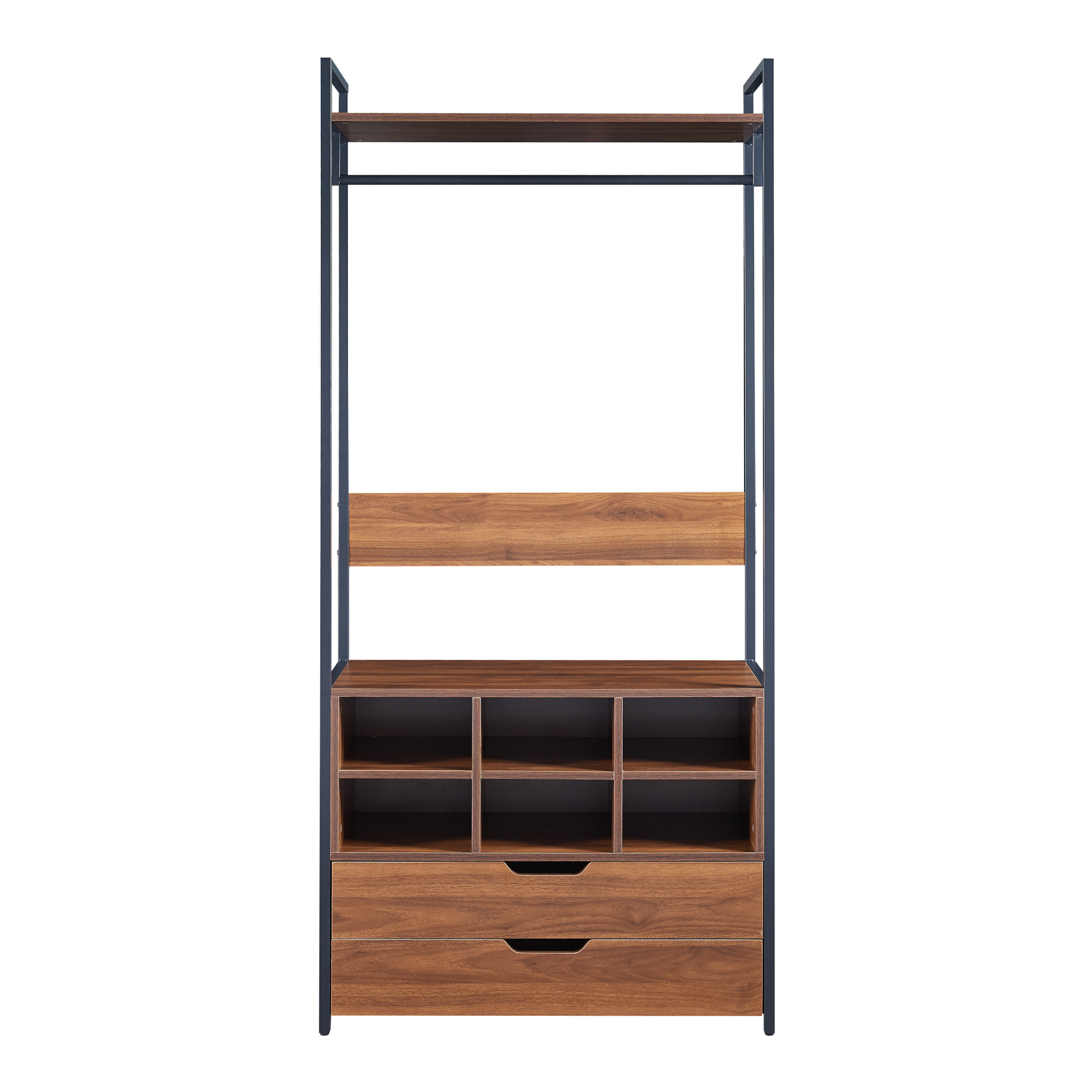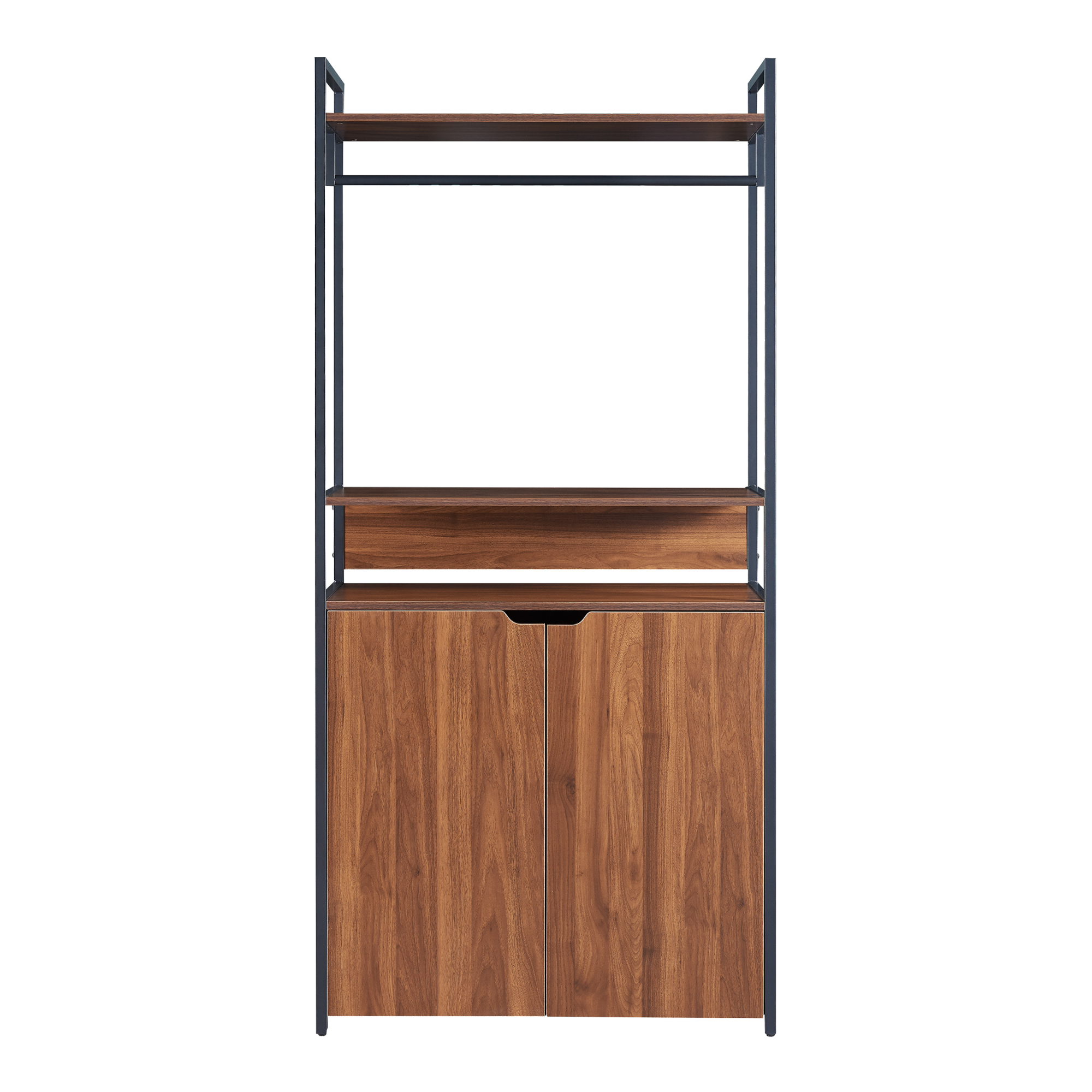 Setul de 2 dulapuri garderobă Larem este soluția ideală pentru organizarea eficientă a hainelor, pantofilor și accesoriilor în hol, dormitor sau dressing. Cu un design modern în nuanță de nucă și cadru metalic negru, acest set garderobă cu bară pentru haine îmbină aspectul elegant cu spațiul generos de depozitare.