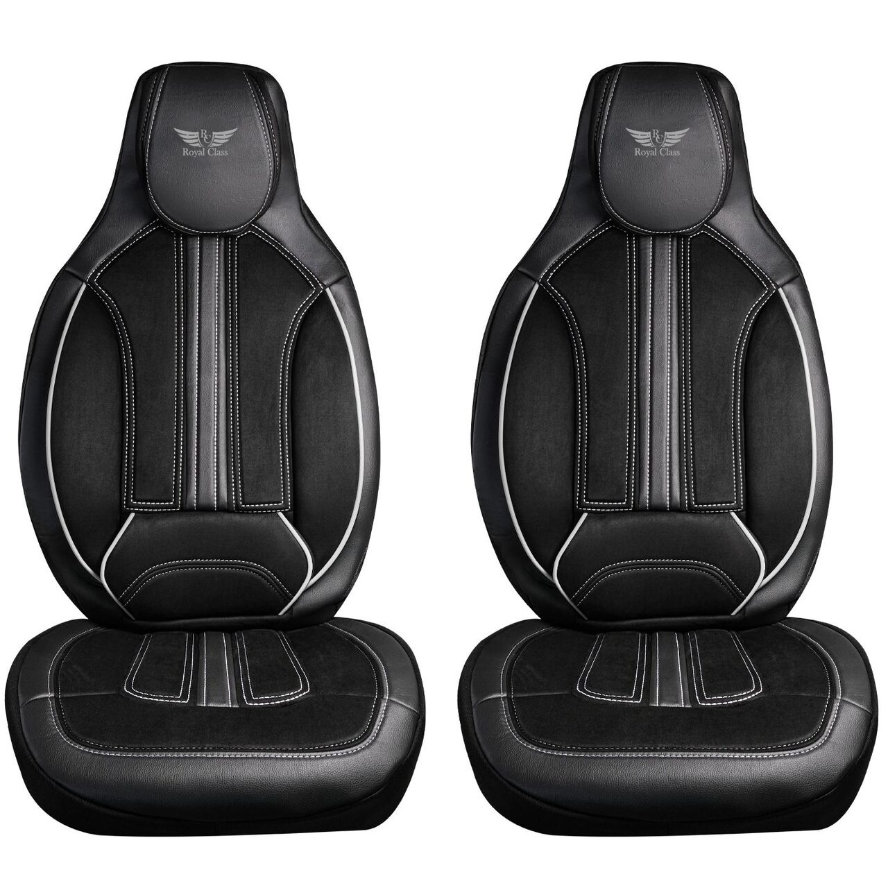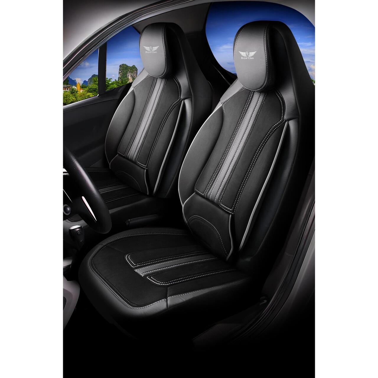 Set 2 Huse Scaune Fata Auto, Ergonomice, Panda, compatibile cu tetiere incorporate- monobloc, tip alcantara si piele ecologica, negru cu cusatura gri Automobile ProTravel