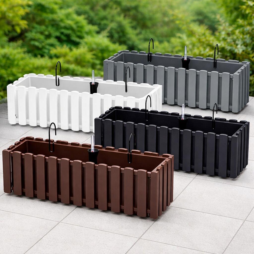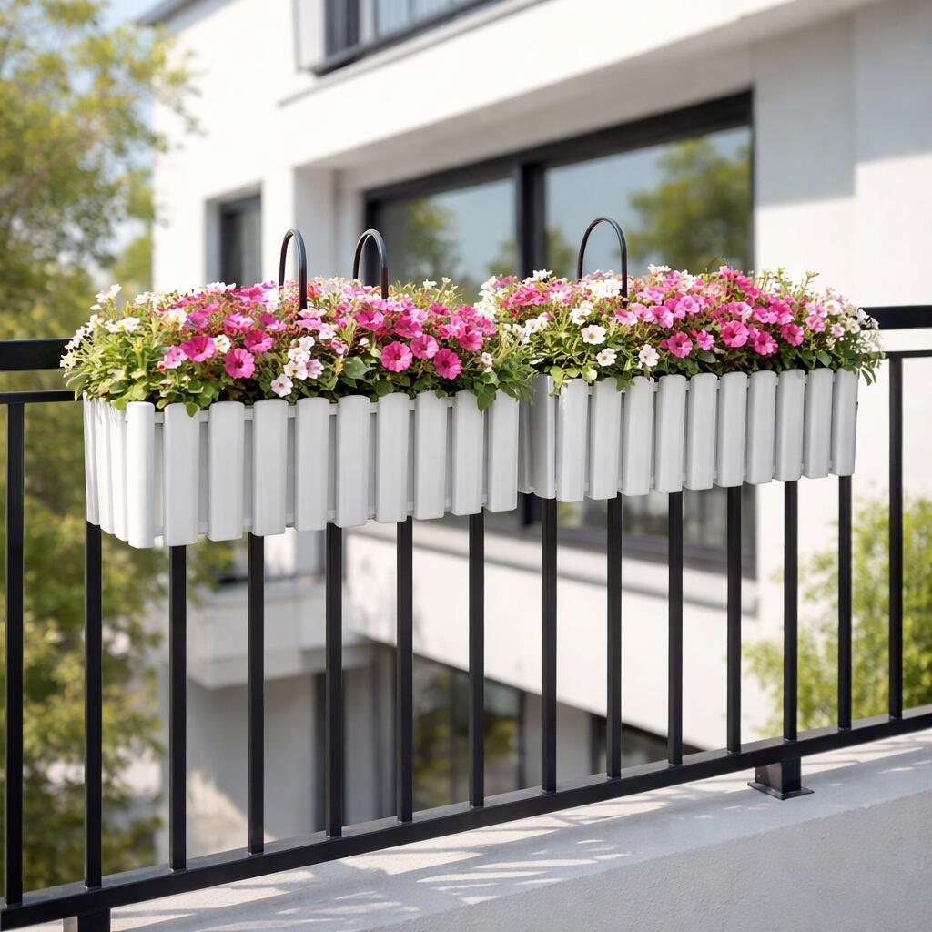 Fixare Solida pe Balustrada: Suportii metalici inclusi sunt discreti dar extrem de rezistenti, fiind proiectati sa sustina jardiniera in siguranta, indiferent de etajul la care este montata