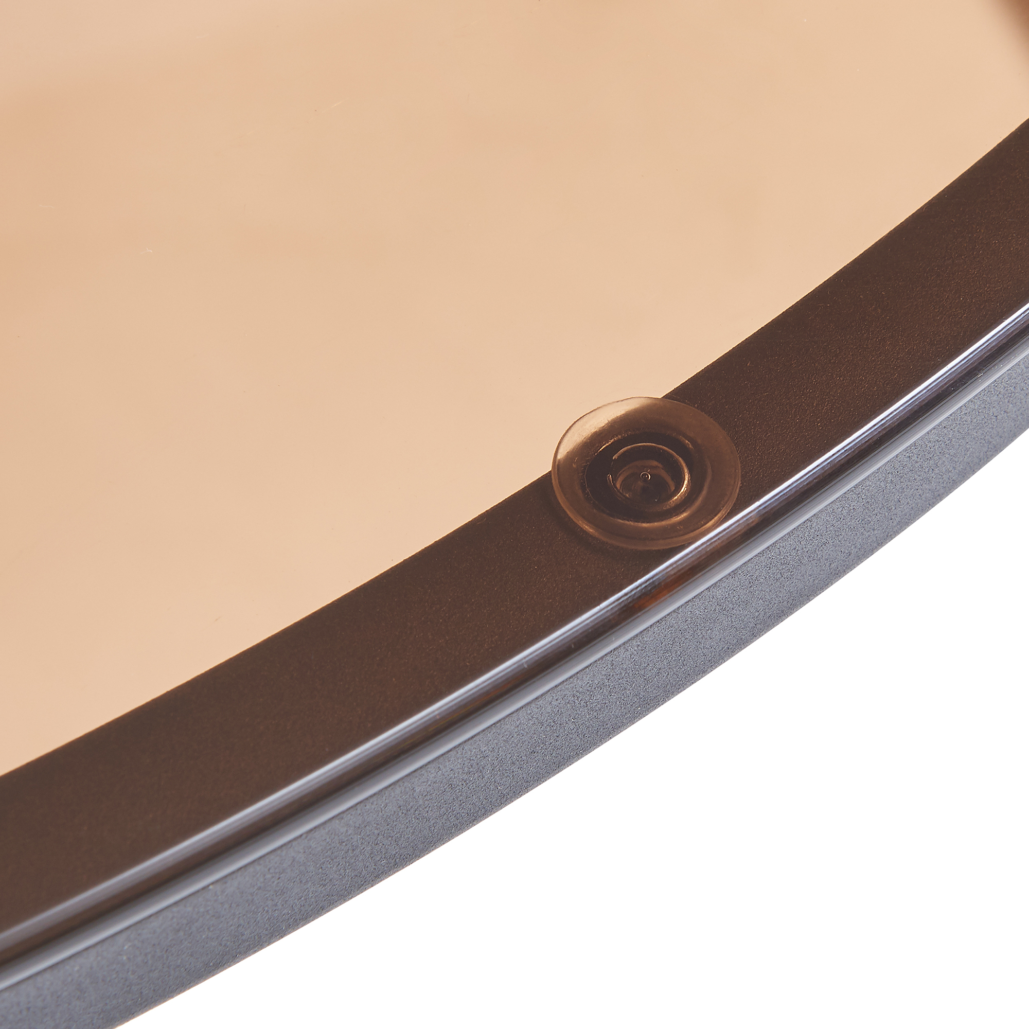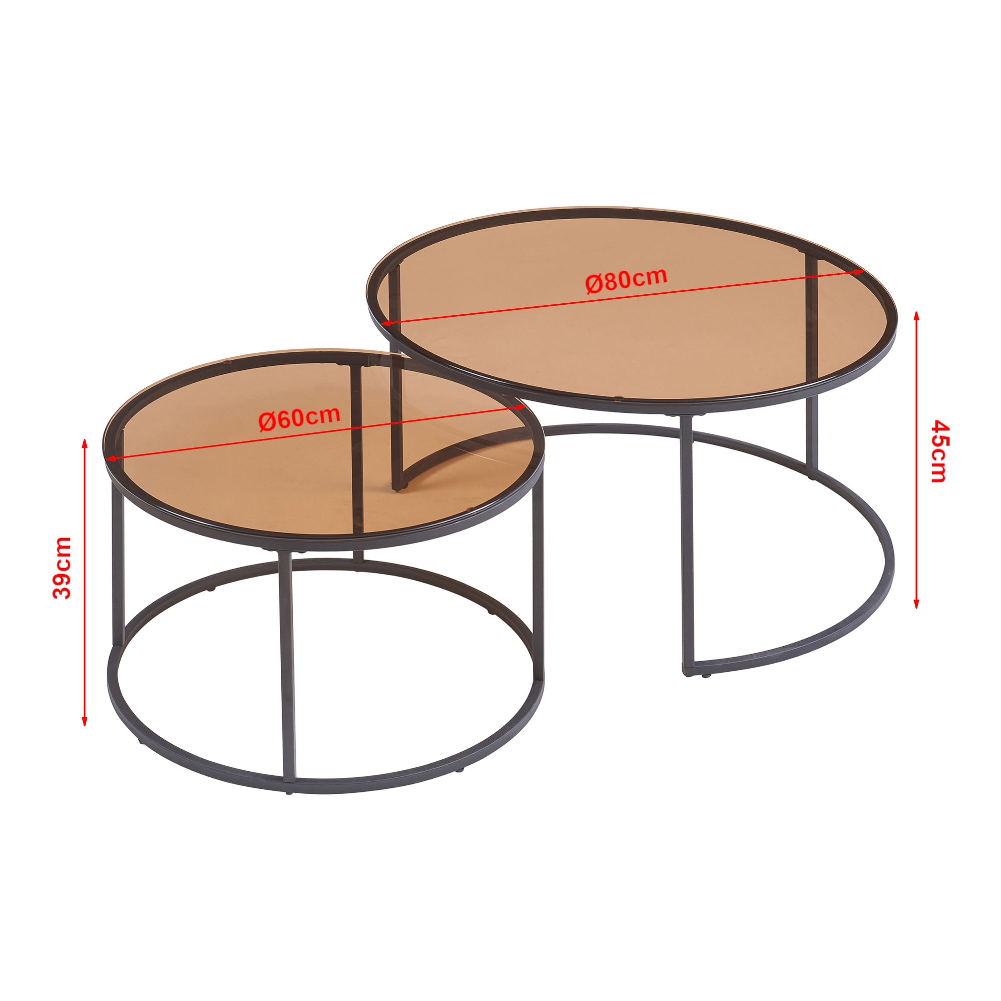 Datorită designului cu înălțimi diferite, mesele pot fi suprapuse parțial pentru a economisi spațiu atunci când nu sunt folosite. Blaturile rotunde din sticlă securizată fumurie în nuanță maro oferă un aspect rafinat, iar cadrul din oțel vopsit electrostatic asigură stabilitate și durabilitate. Sunt potrivite pentru servirea cafelei, expunerea decorațiunilor sau ca măsuță auxiliară lângă canapea.