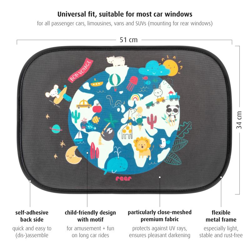 Protejeaza-i pe cei mici in timpul drumurilor cu acest set de parasolare auto pentru copii Reer TravelKid Sun. Concepute pentru a reduce disconfortul creat de soarele puternic, parasolarele ofera protectie UV 50+, umbra placuta si ajuta la limitarea incalzirii habitaclului. Sistemul de lipire fara ventuze, bazat pe aderenta electrostatica, permite montarea rapida direct pe geam, fara urme la indepartare.