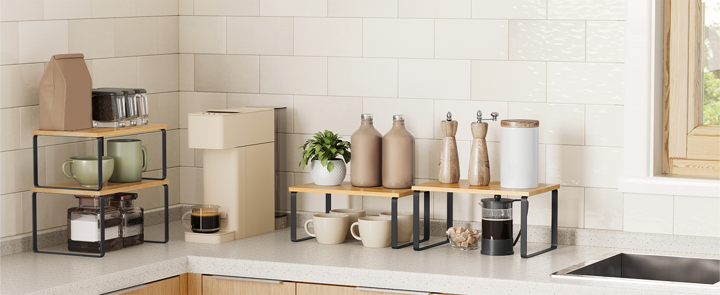 Organizeaza mai usor blatul sau dulapul cu acest set de 2 rafturi de bucatarie suprapozabile Songmics, ideal pentru condimente, ustensile, recipiente, conserve sau carti de bucate. Designul modern, in nuante natur si negru, se potriveste usor in bucatarii contemporane, iar configurarea flexibila iti permite sa folosesti rafturile suprapuse, separate, imbinate sau in forma de L, in functie de spatiul disponibil.