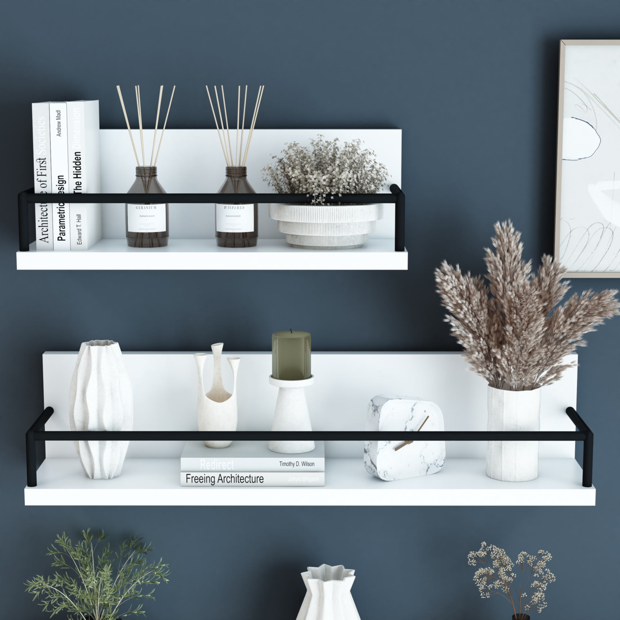 Datorita designului minimalist cu polite albe si cadru metalic negru, aceste rafturi suspendate se integreaza usor in amenajari contemporane, scandinave sau industriale. Cele doua dimensiuni diferite iti permit sa creezi o compozitie vizuala atractiva si sa folosesti eficient peretele disponibil.