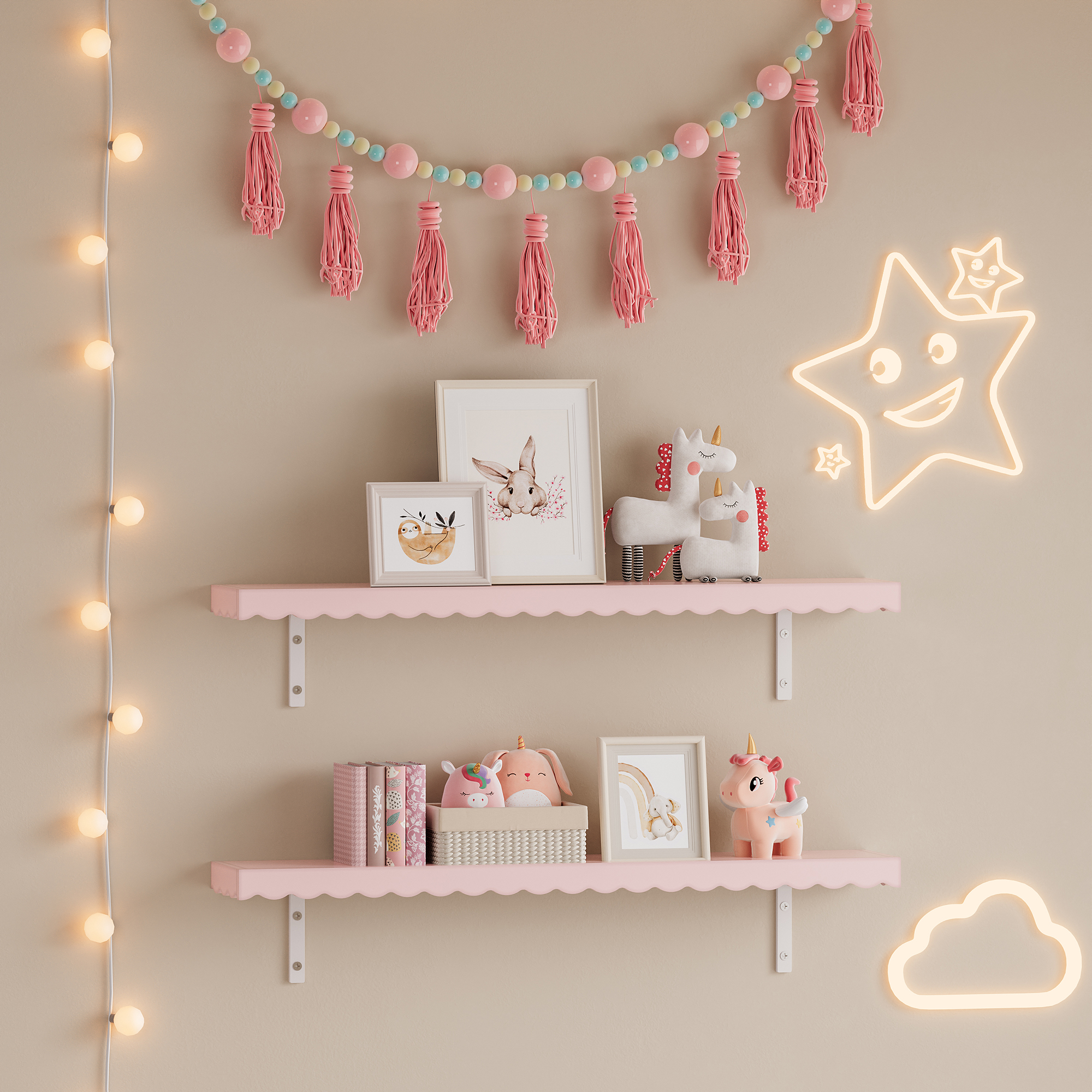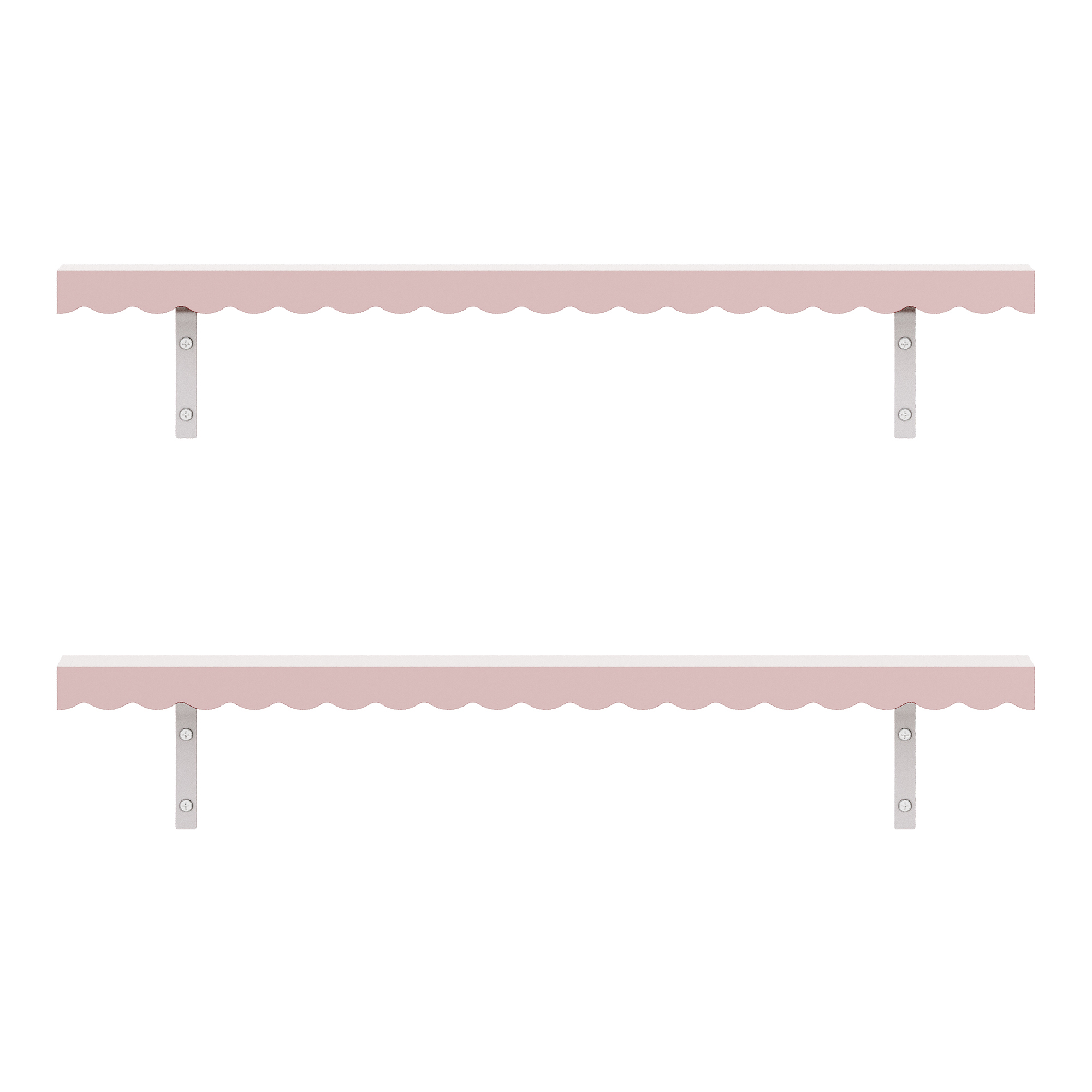 Adauga un plus de farmec si organizare in camera celui mic cu acest set de rafturi de perete pentru copii Vestnes. Cu un design delicat, in nuanta roz Cotton Candy si cu margine decorativa ondulata, rafturile sunt ideale pentru a expune carti, jucarii mici, decoratiuni sau amintiri dragi intr-un mod practic si placut vizual.