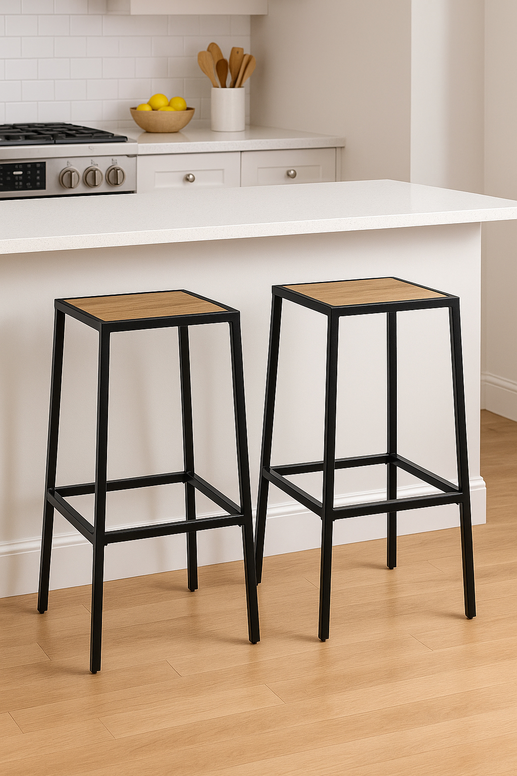 Aceste scaune bar din otel sunt concepute pentru utilizare zilnica, oferind stabilitate si durabilitate. In plus, designul compact le face usor de integrat in spatii mai mici, fara sa incarce vizual incaperea. Suprafata sezutului cu aspect de lemn adauga un contrast placut si un plus de stil.