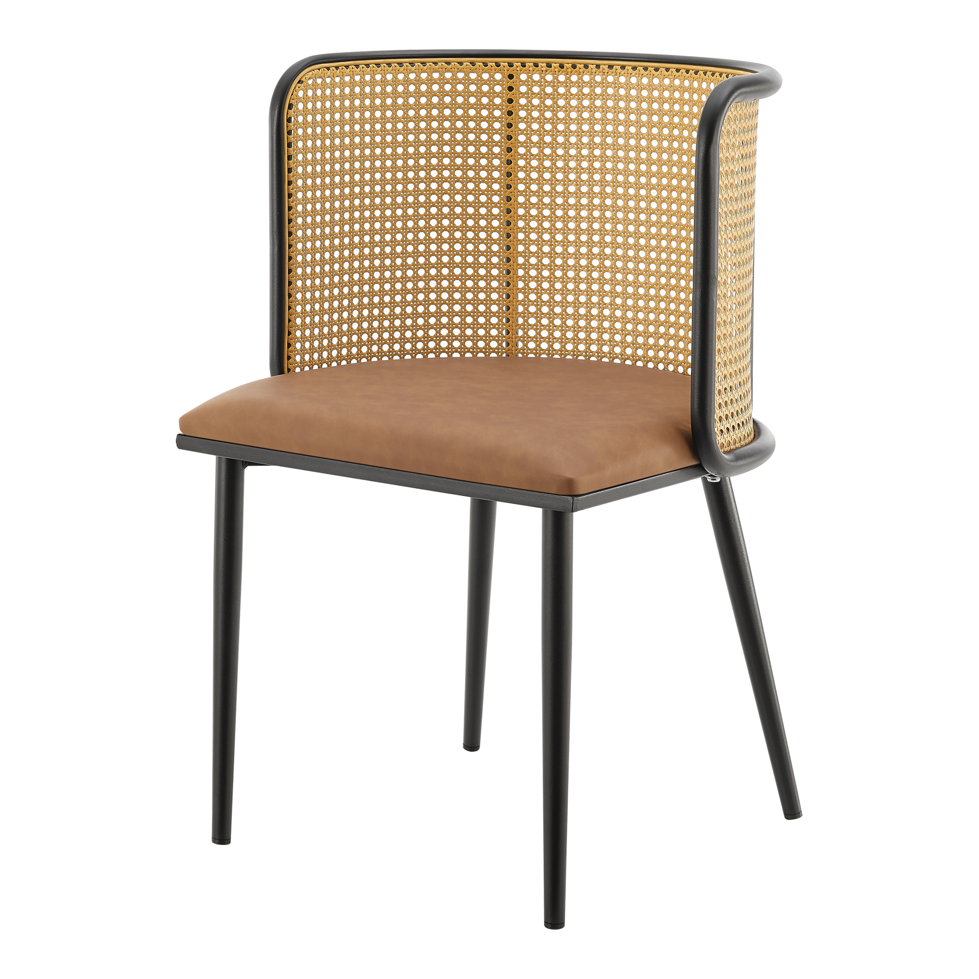 Setul de 2 scaune dining Flen aduce un plus de stil și confort în orice locuință. Cu un design modern cu influențe naturale, aceste scaune dining combină armonios spătarul din ratan, șezutul tapițat maro și cadrul metalic negru, fiind ideale pentru zona de luat masa, bucătărie sau living.