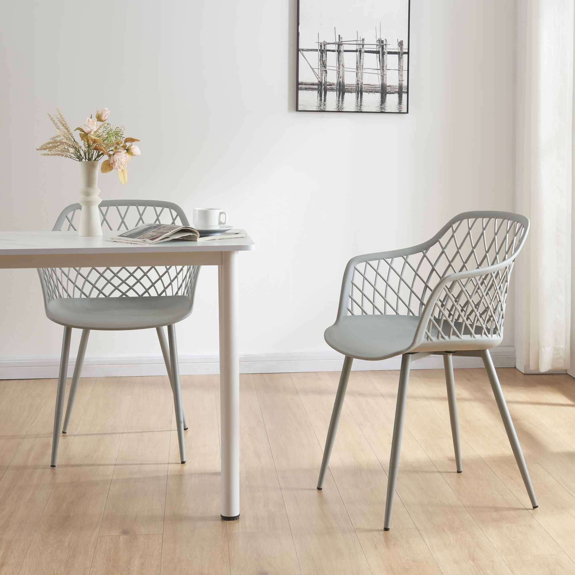 Acest set scaune bucatarie este ideal pentru mesele de zi cu zi, pentru amenajarea unui colt de dining elegant sau pentru completarea unei zone de socializare cu accente minimaliste. Nuanta gri deschis si aspectul modern il fac usor de asortat cu mese albe, din lemn sau metal.