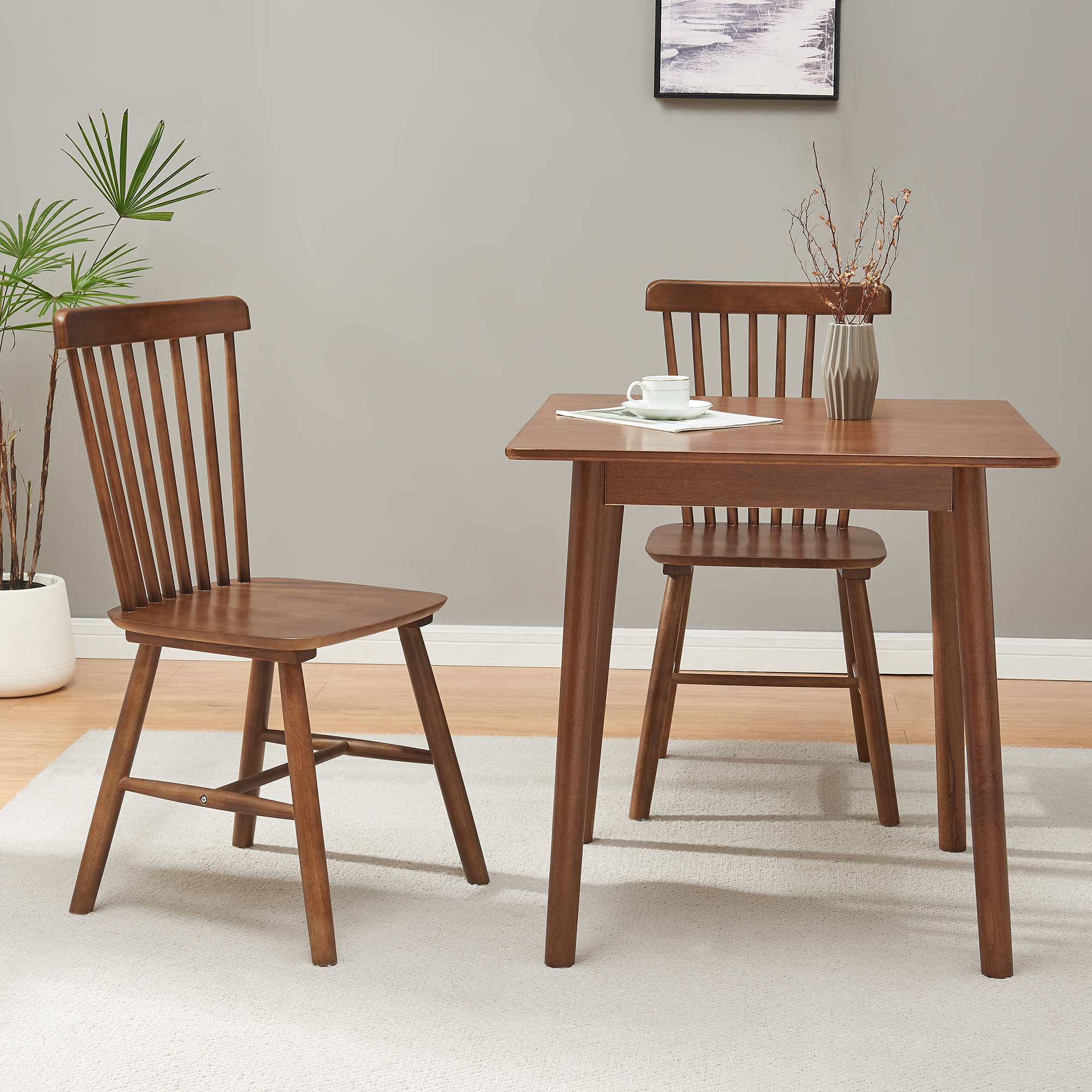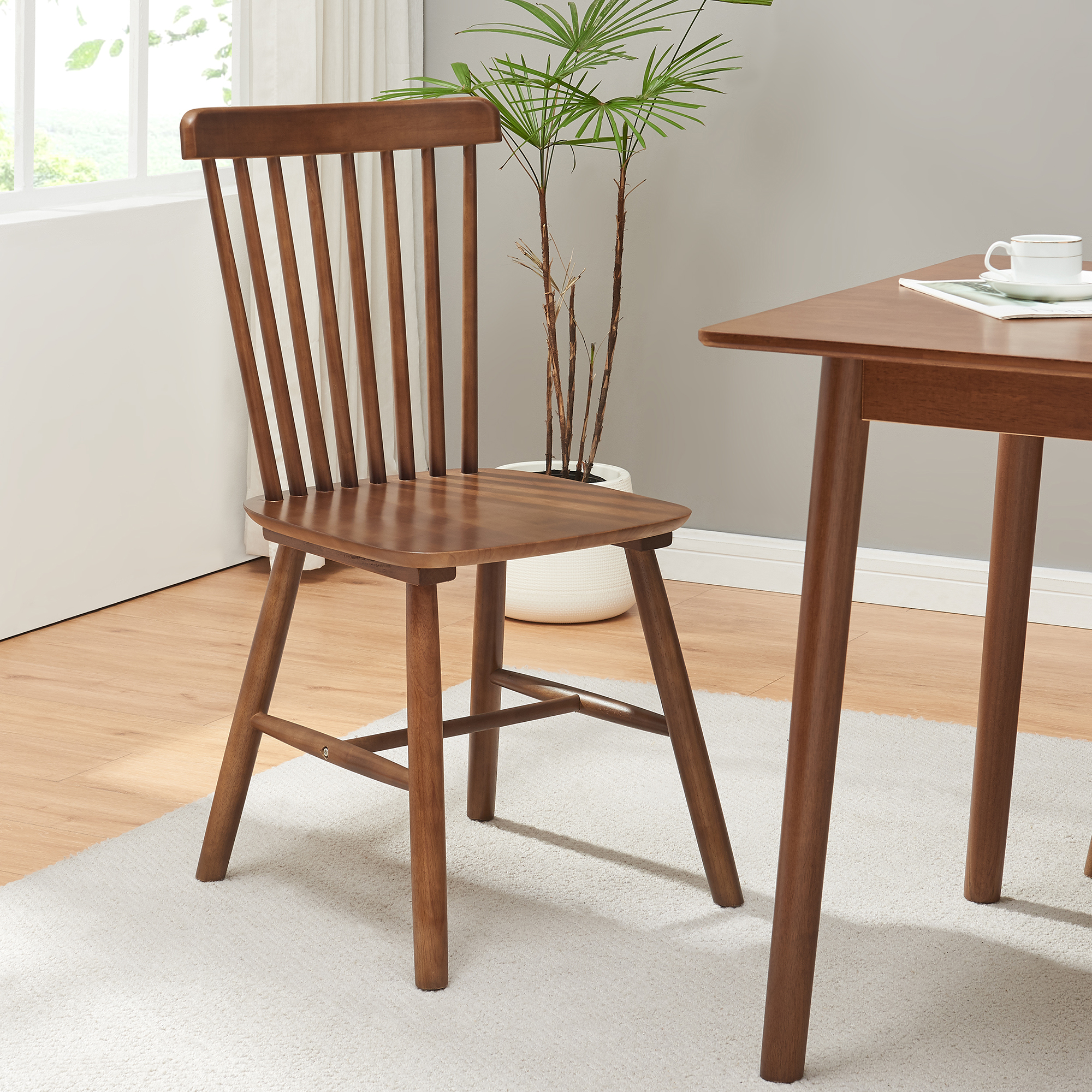Adauga un plus de stil si confort in casa ta cu acest set de 2 scaune dining Karmoy, realizat din lemn de arbore de cauciuc si finisat elegant in nuanta nuc. Designul lor clasic, cu spatar inalt si bare verticale, se potriveste usor in dining, bucatarie, living sau chiar in zona de lucru de acasa.