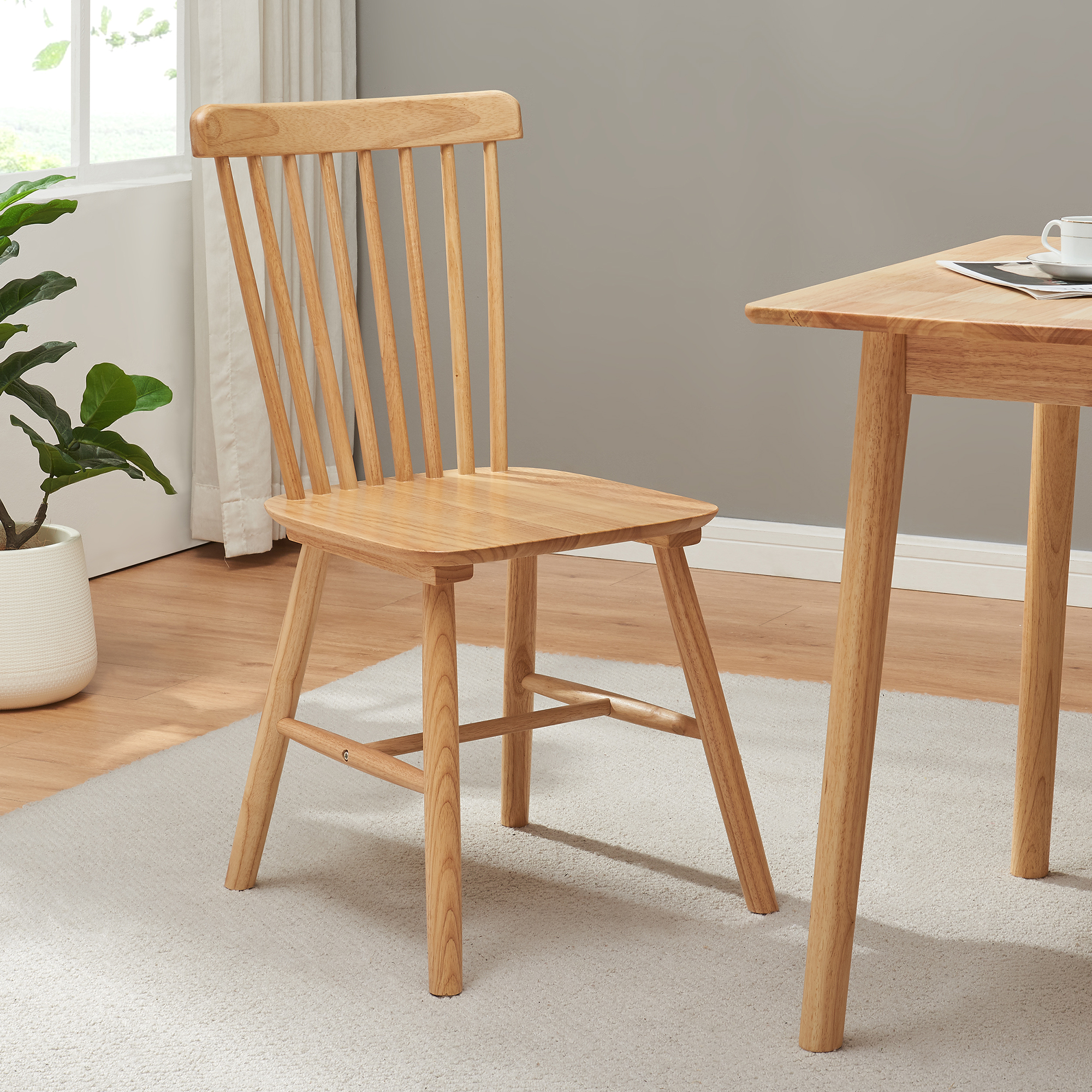 Spatarul robust, cu bare verticale, sustine o pozitie confortabila la sedere si ofera un aspect elegant, inspirat din stilul scandinav si rustic modern. Fie ca le folosesti la masa, pentru lectura, lucru la birou sau atunci cand primesti musafiri, aceste scaune dining lemn natur sunt o alegere practica si estetica.