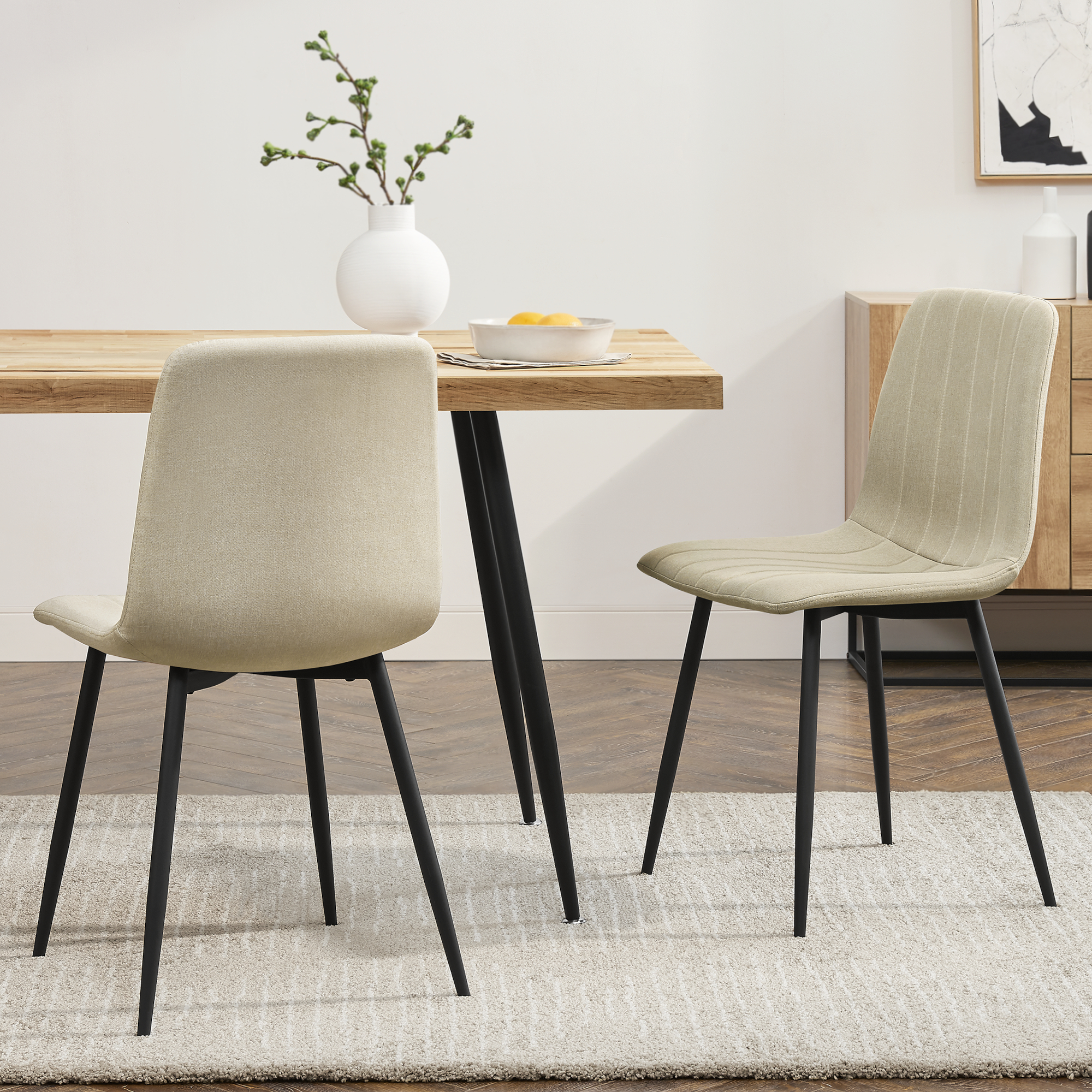 Setul de 2 scaune dining tapițate Elsern este alegerea ideală pentru cei care își doresc un spațiu primitor, modern și confortabil. Cu un design simplu și elegant, aceste scaune dining bej completează armonios decorul din sufragerie, bucătărie sau zona de dining și oferă o experiență plăcută la fiecare masă.