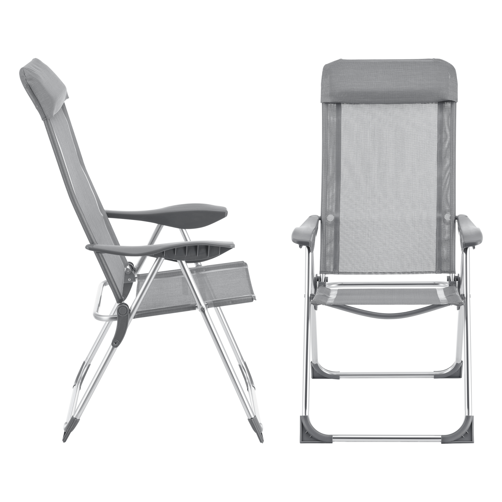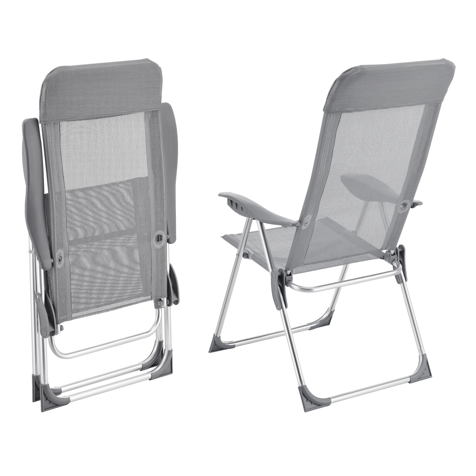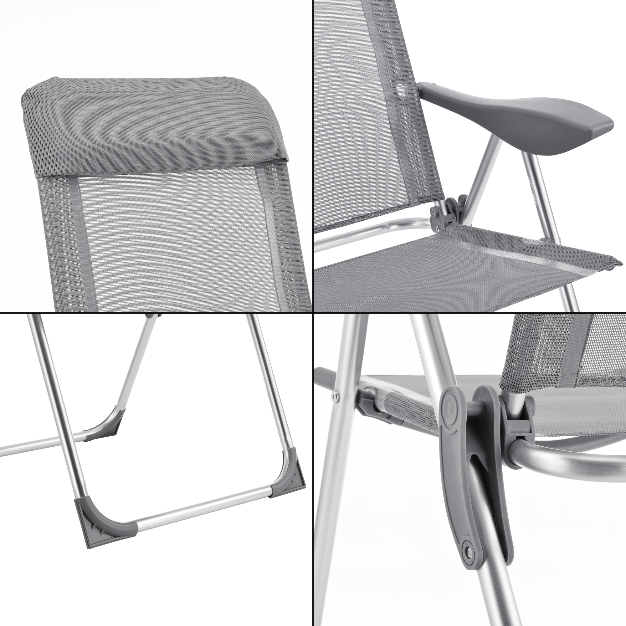 Fiecare scaun pliabil este prevăzut cu cotiere confortabile și un spătar reglabil în 5 poziții, astfel încât să poți alege rapid poziția potrivită pentru masă, lectură sau relaxare. Cadrul din aluminiu contribuie la o utilizare practică, iar materialul textil rezistent la intemperii îl face potrivit pentru utilizare frecventă în exterior.