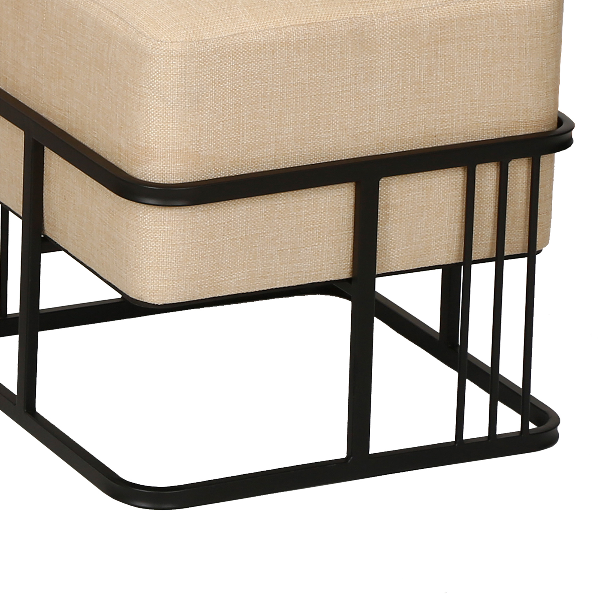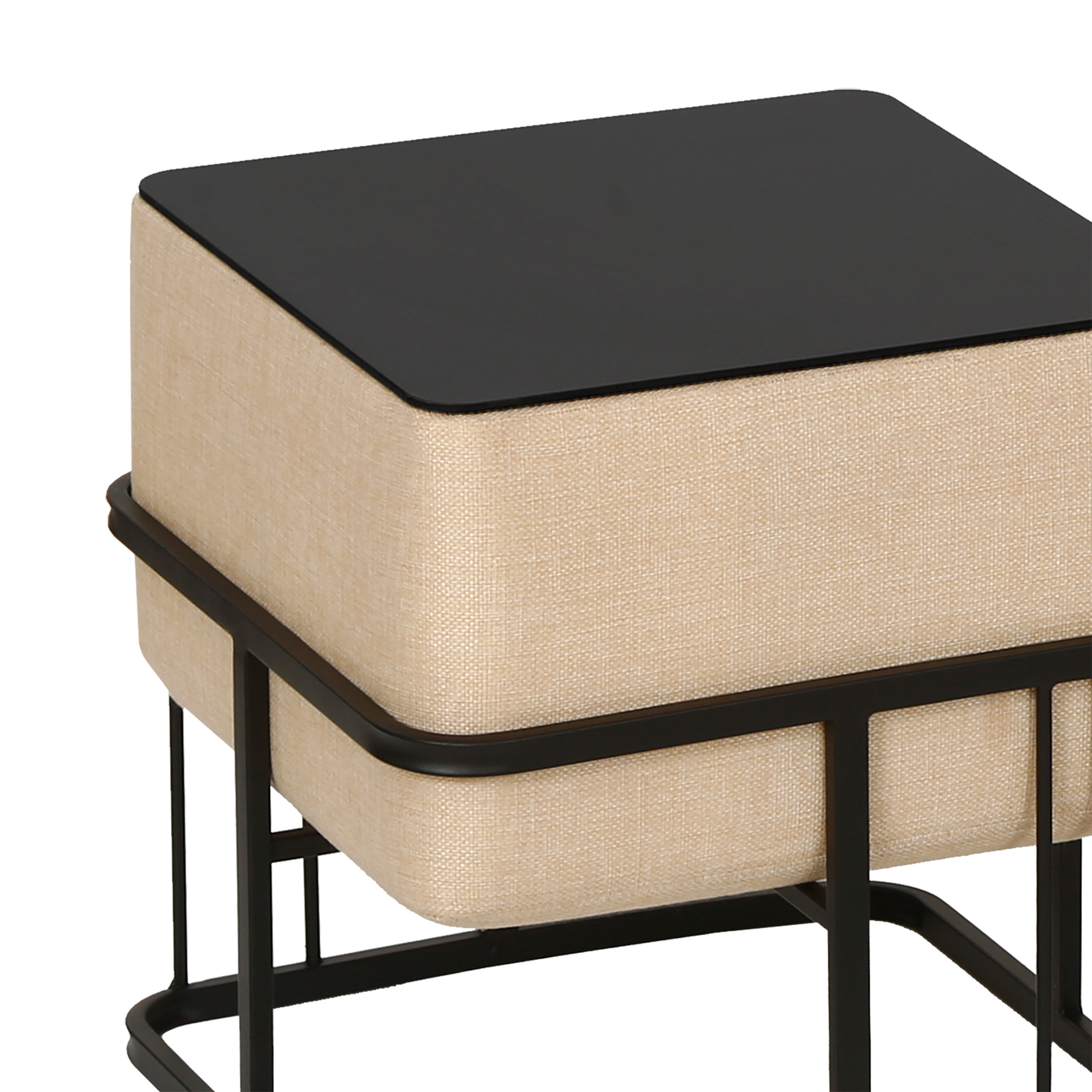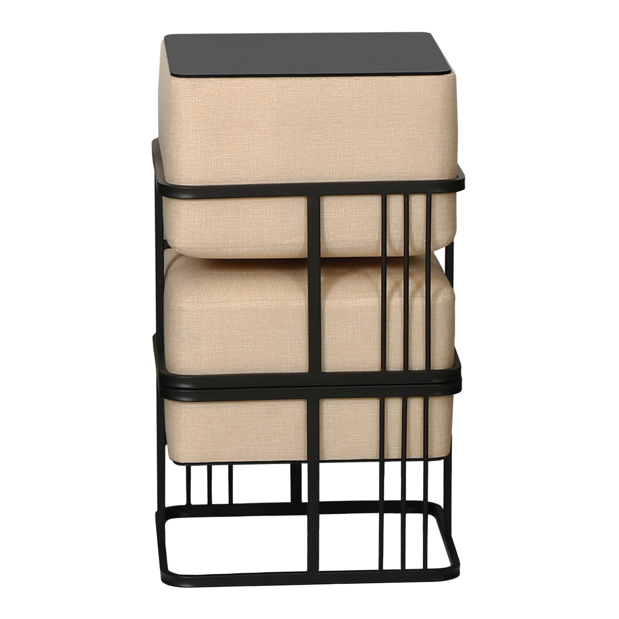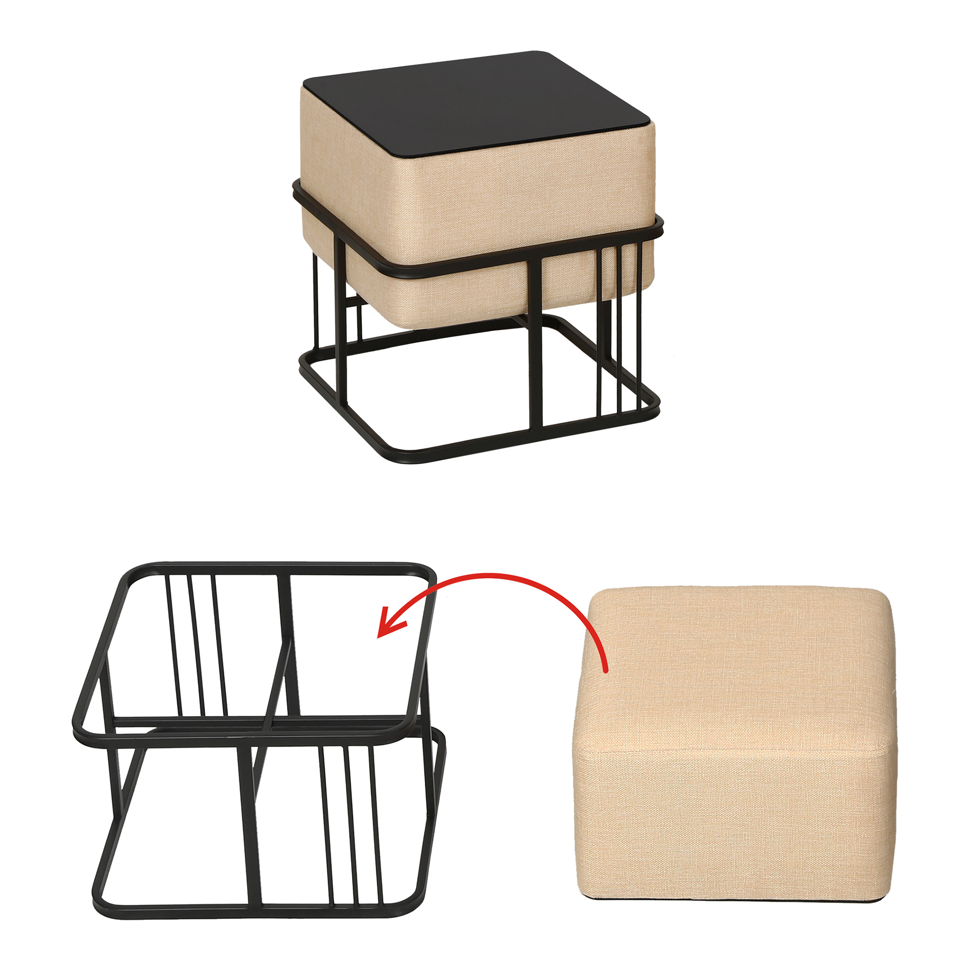 Șezutul moale și bine capitonat oferă un plus de confort, iar prin simpla răsturnare, fiecare taburet se transformă rapid într-o măsuță stabilă, cu suprafață netedă, perfectă pentru cărți, băuturi sau obiecte decorative. Designul pătrat, în nuanță bej cu structură metalică neagră, se integrează ușor în decoruri contemporane, minimaliste sau cozy.