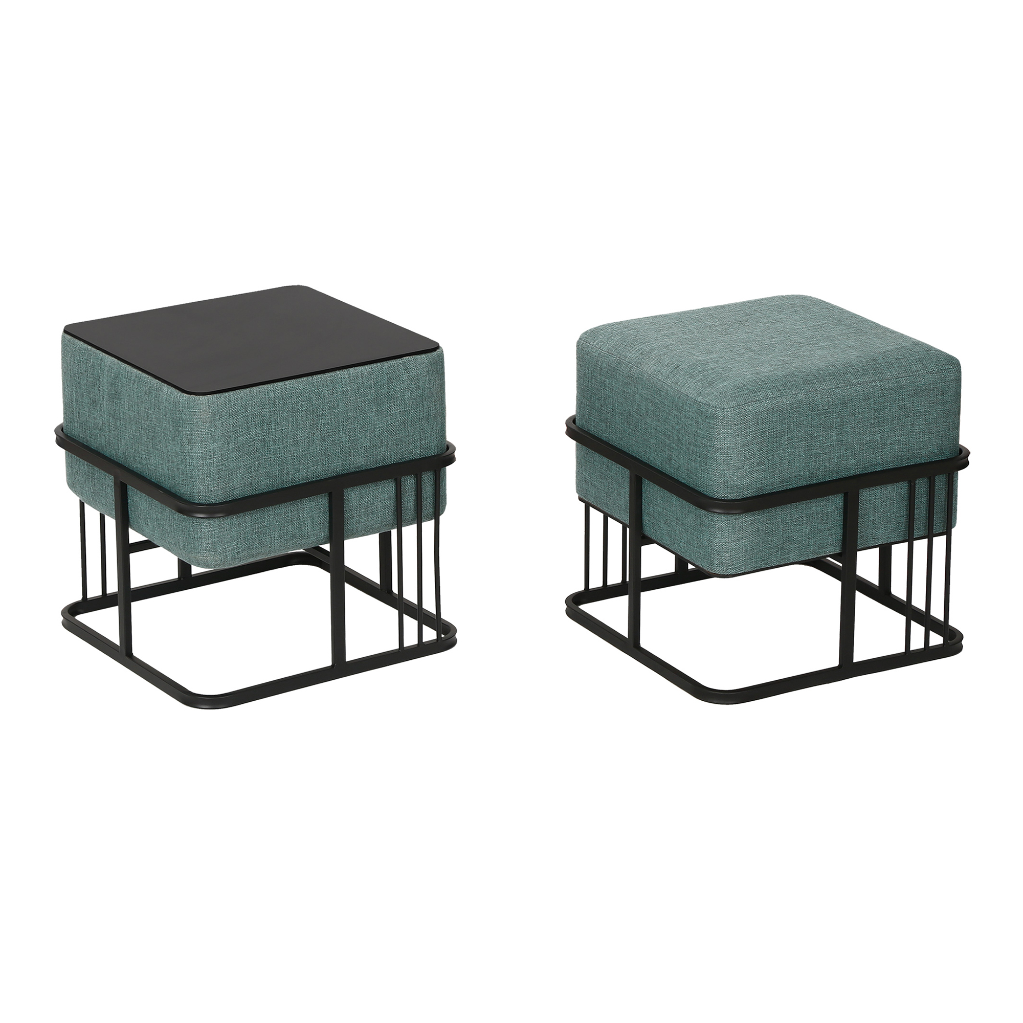 Șezutul moale, bine capitonat, oferă un plus de confort la utilizare, iar prin simpla întoarcere, fiecare taburet se transformă într-o suprafață stabilă pentru băuturi, cărți sau decorațiuni. Designul pătrat, în nuanță verde cu structură metalică neagră, adaugă un aspect modern și ușor de integrat în diferite stiluri de amenajare.