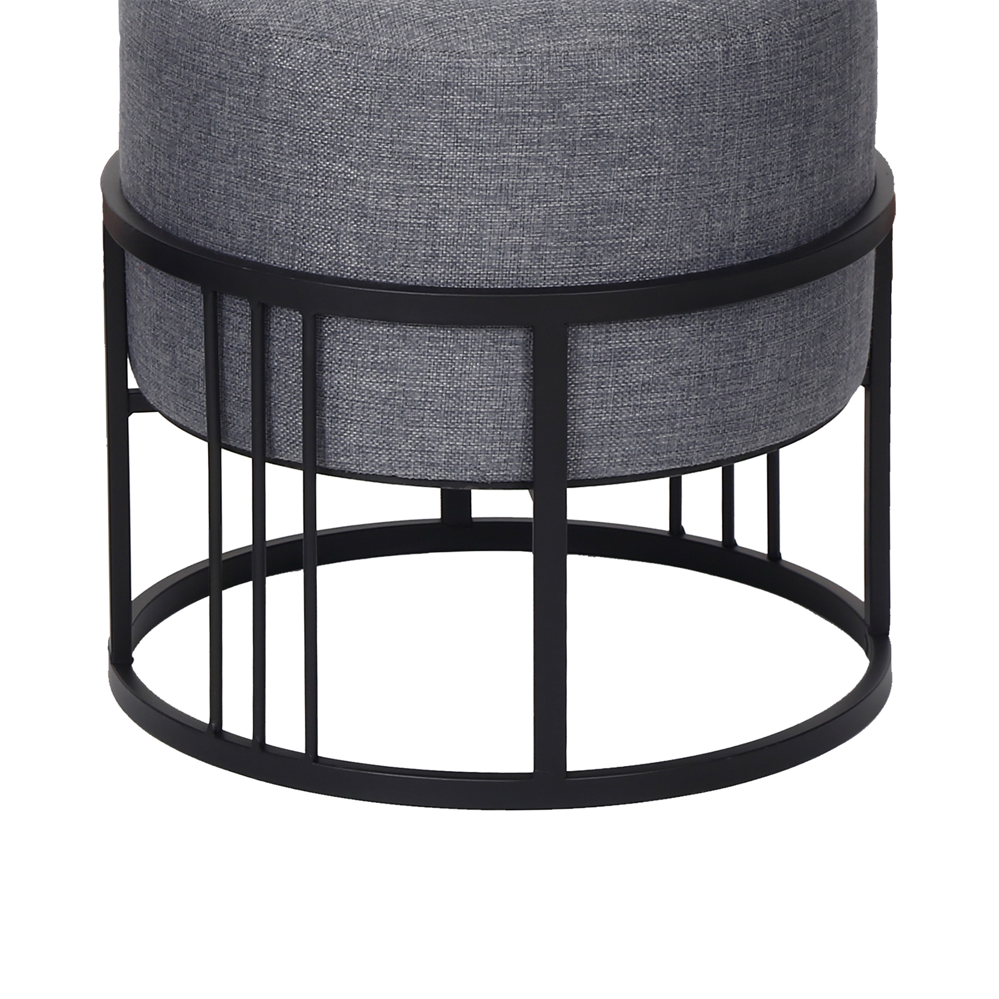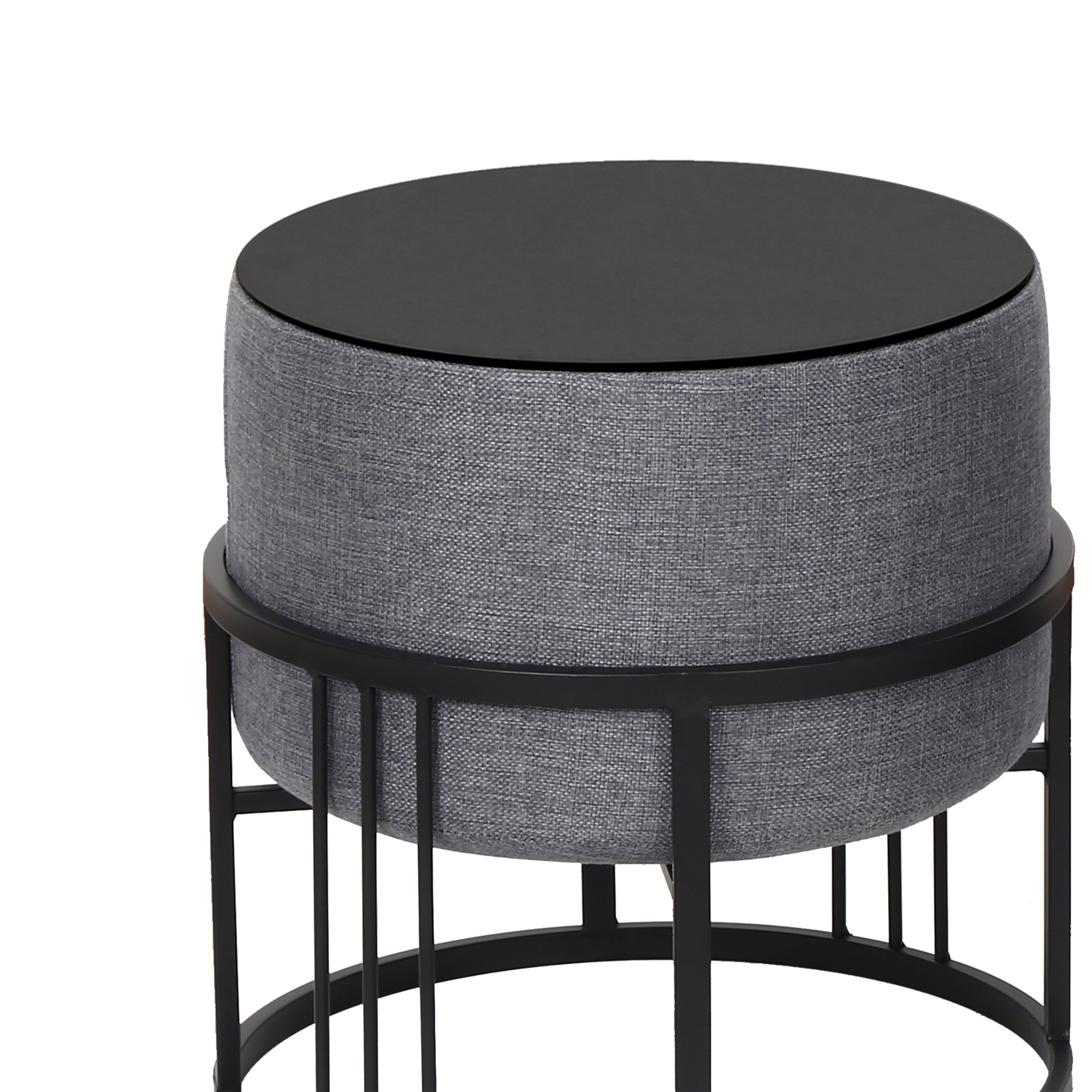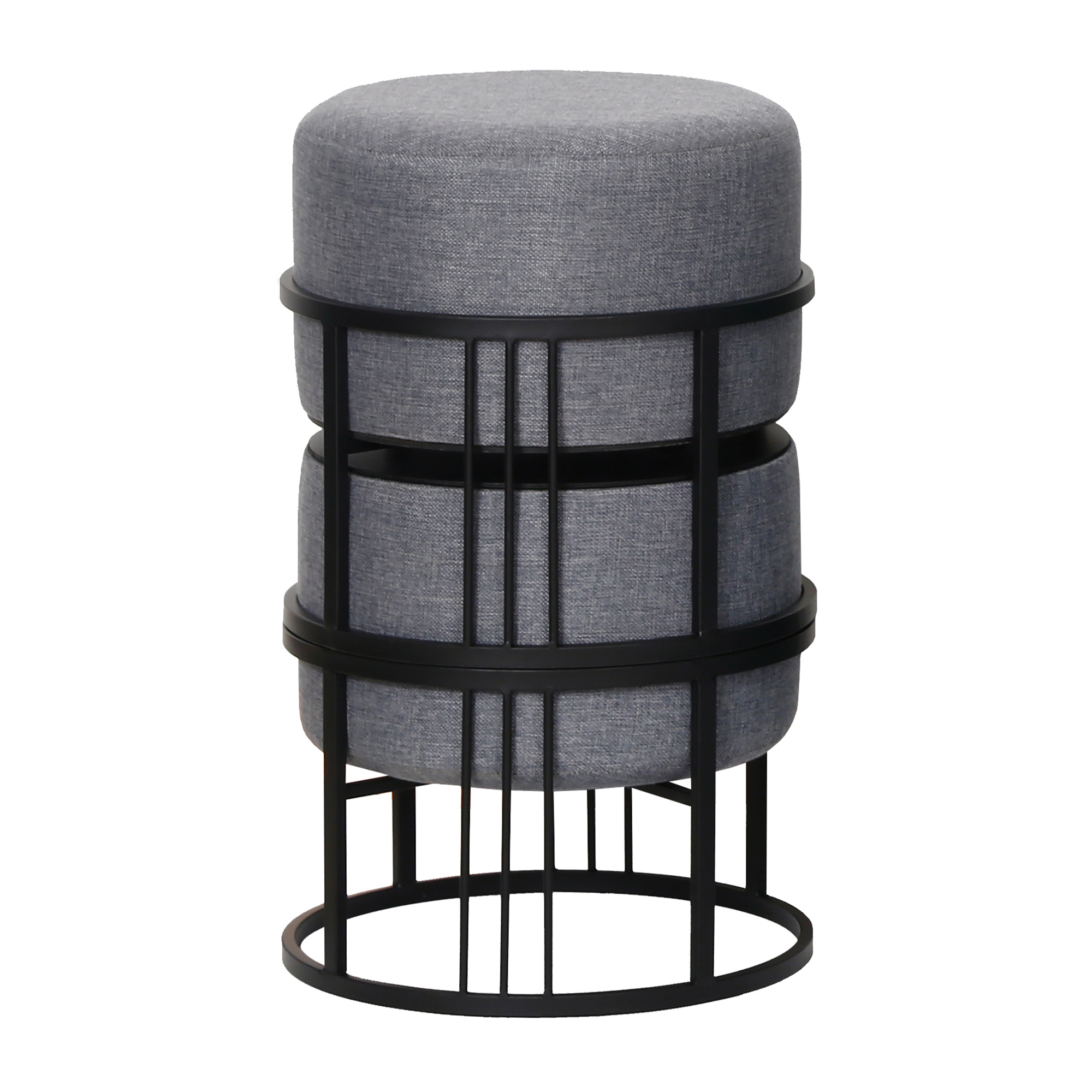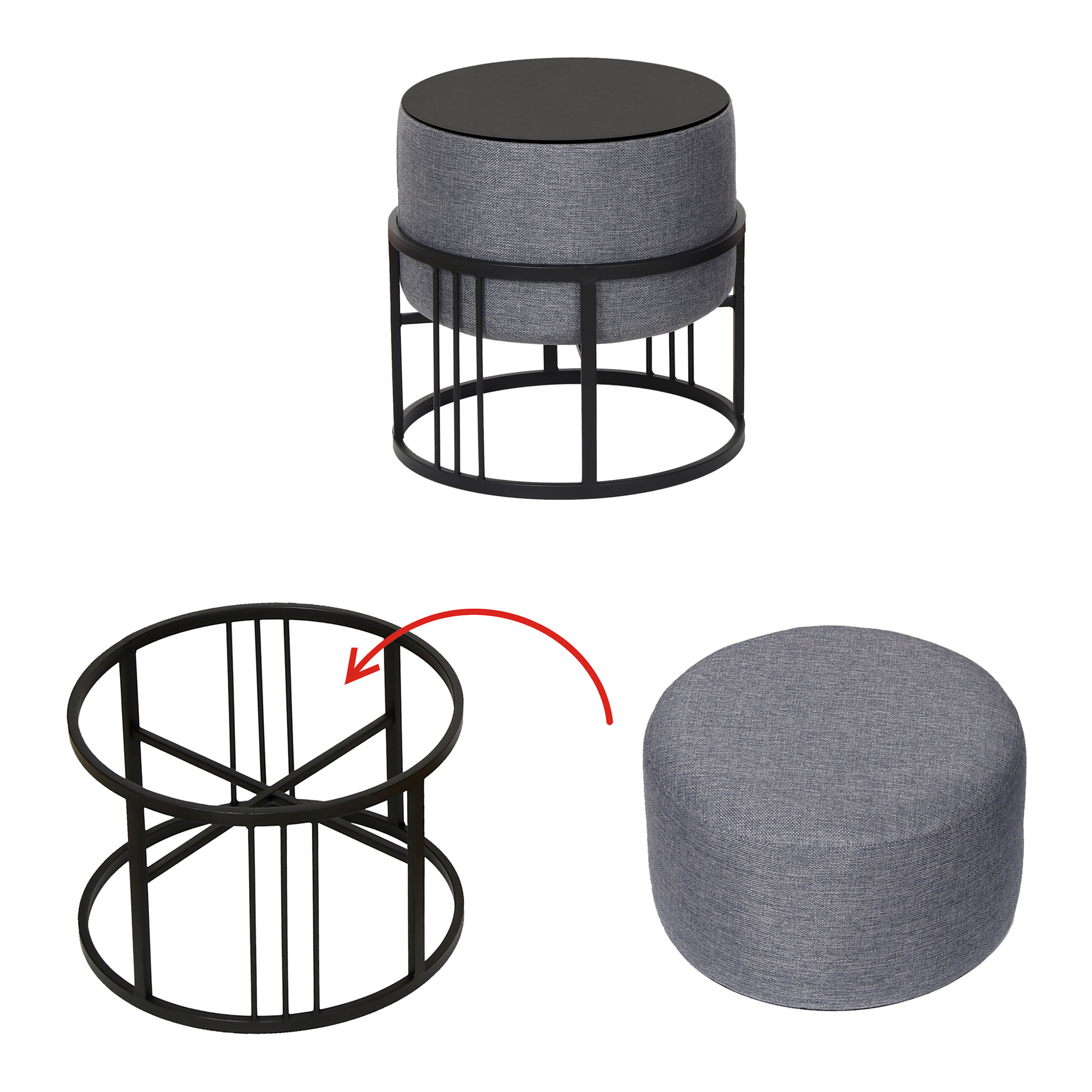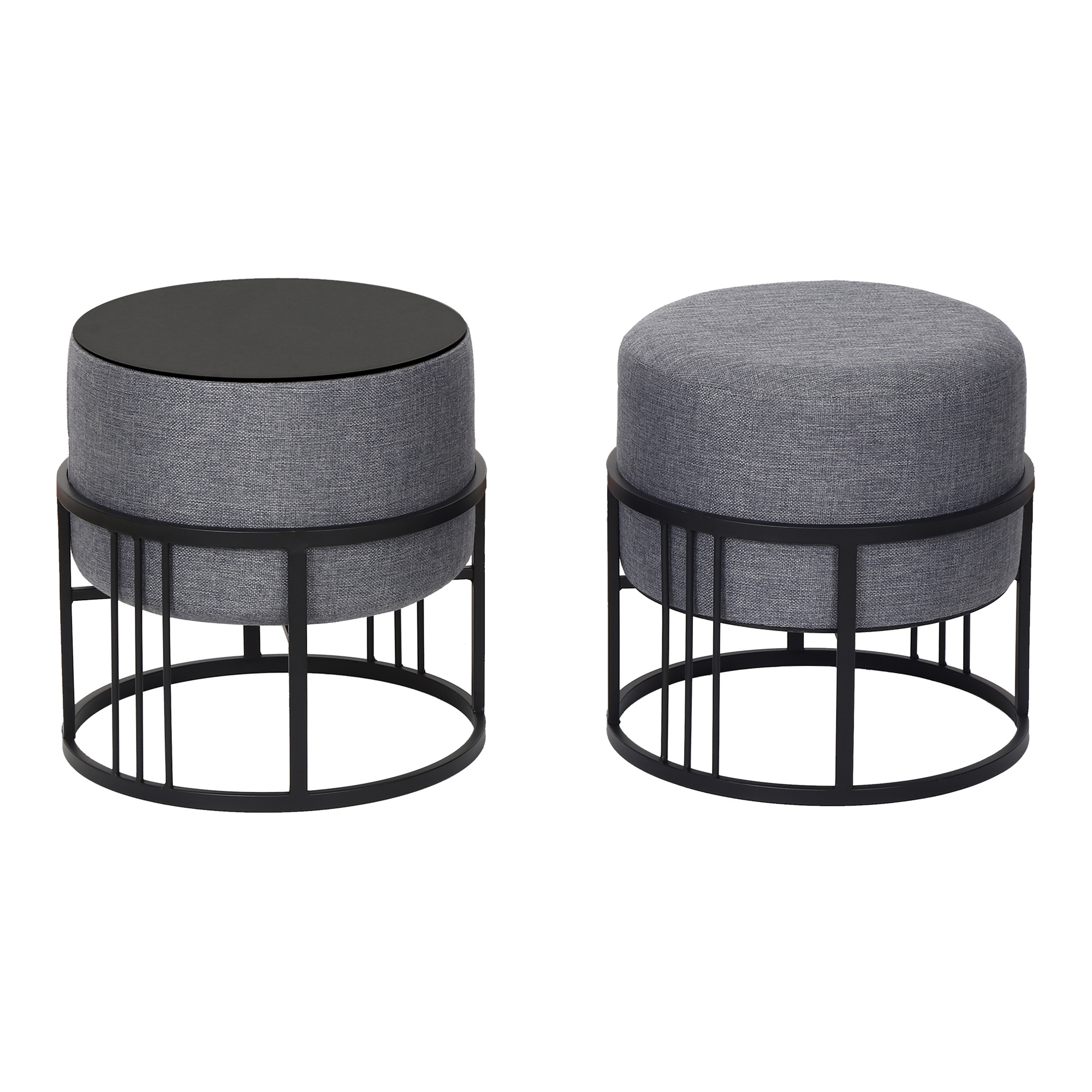 Set 2 în 1 de taburete și măsuțe auxiliare pentru un decor modern și practic. Acest set format din două piese rotunde poate fi folosit atât ca taburet, cât și ca măsuță auxiliară, fiind ideal pentru living, dormitor sau hol. Designul elegant în nuanță gri închis cu structură metalică neagră se integrează ușor în amenajări contemporane.