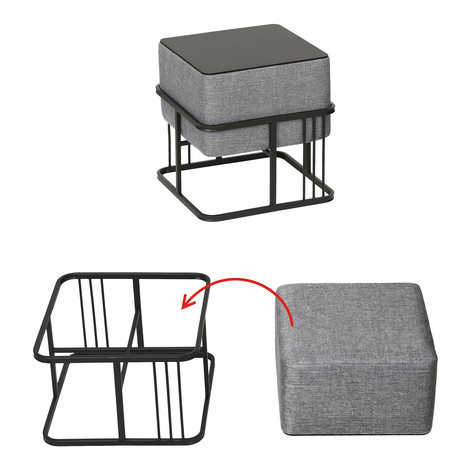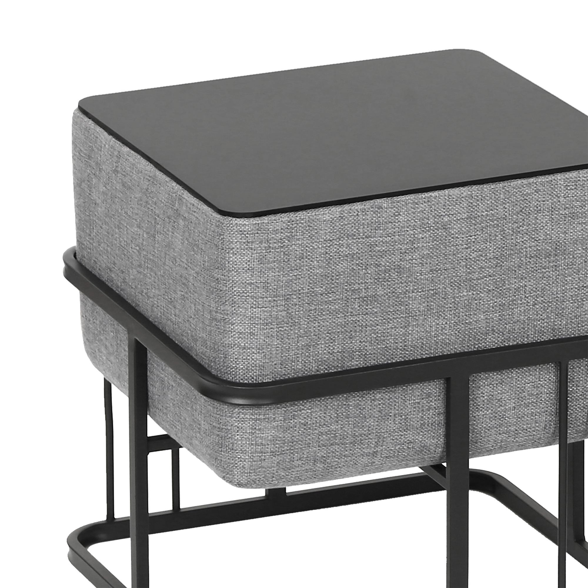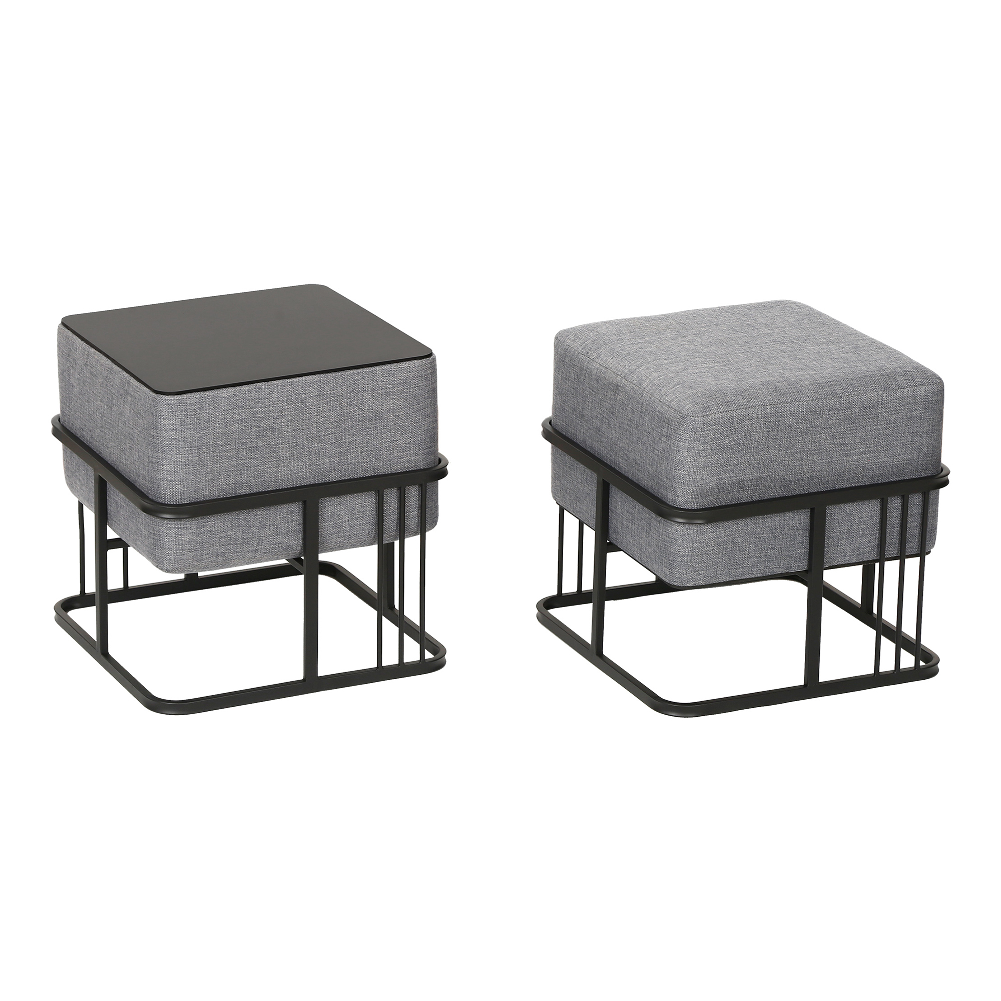 Setul de 2 taburete stivuibile cu funcție de măsuță este o alegere practică și elegantă pentru orice locuință modernă. Fiecare piesă poate fi folosită ca taburet, suport pentru picioare sau măsuță laterală, fiind ideală pentru living, dormitor ori hol. Designul pătrat, tapițeria gri deschis și cadrul metalic negru oferă un aspect contemporan, ușor de integrat în diverse stiluri de amenajare.
