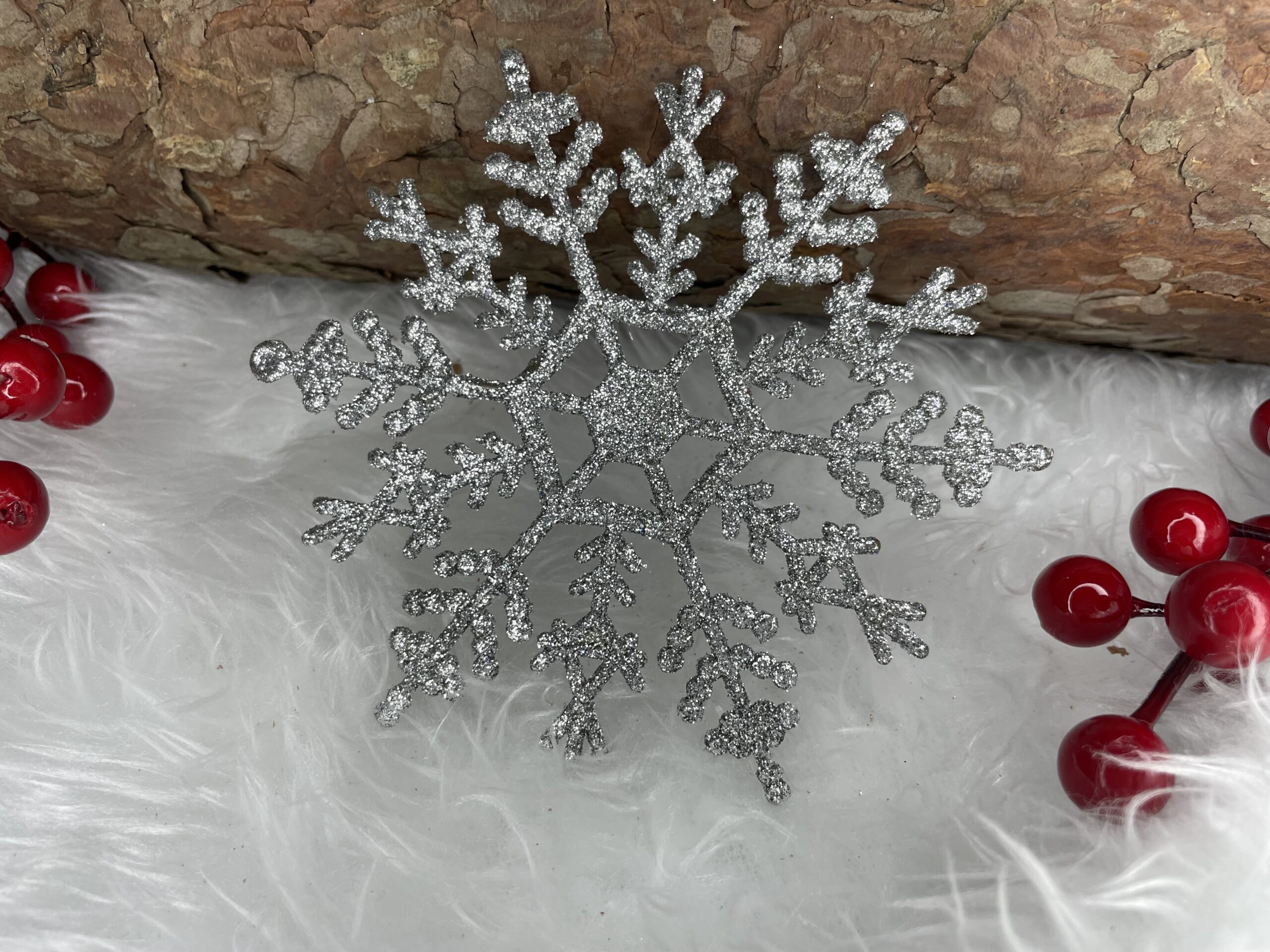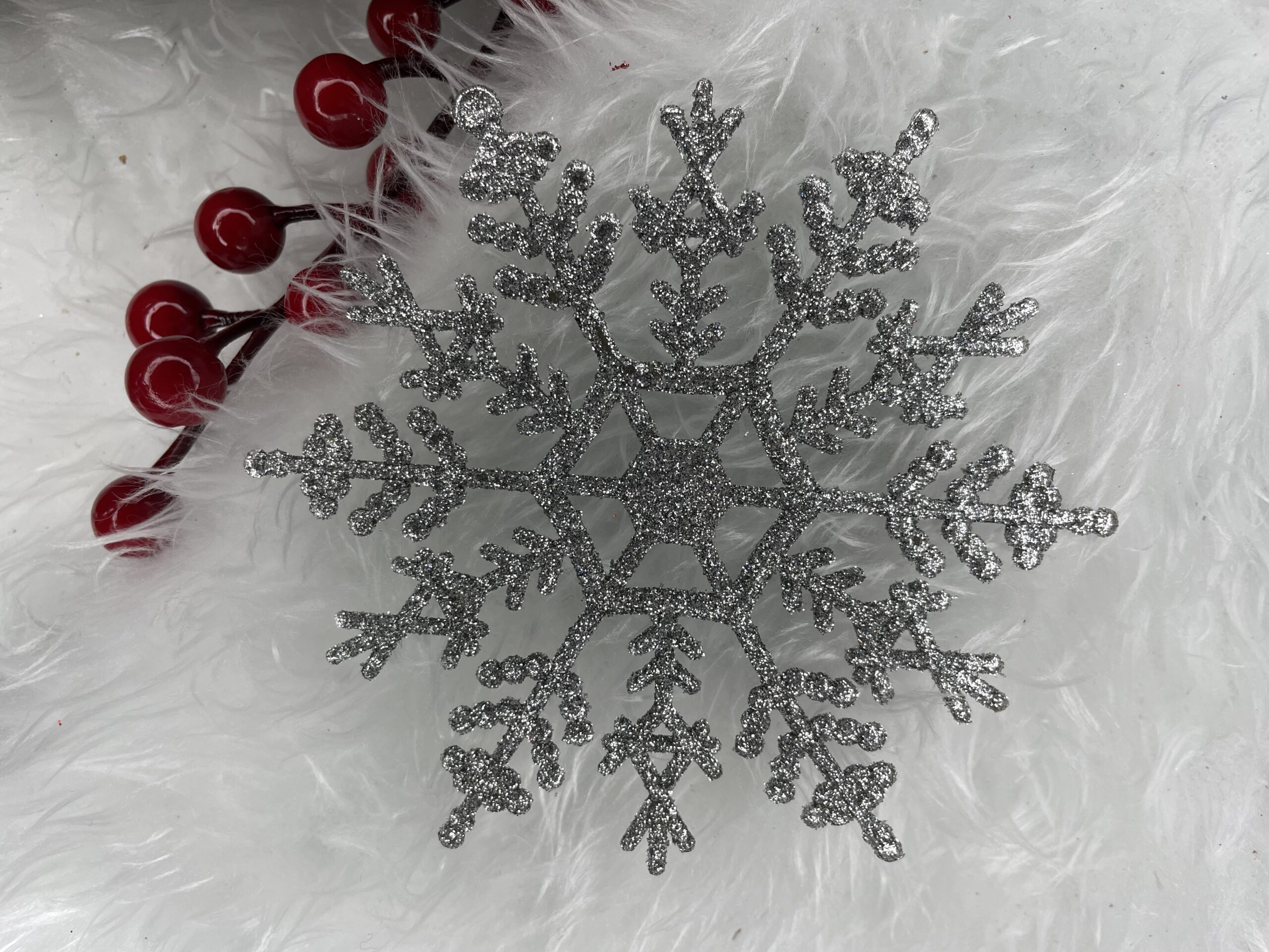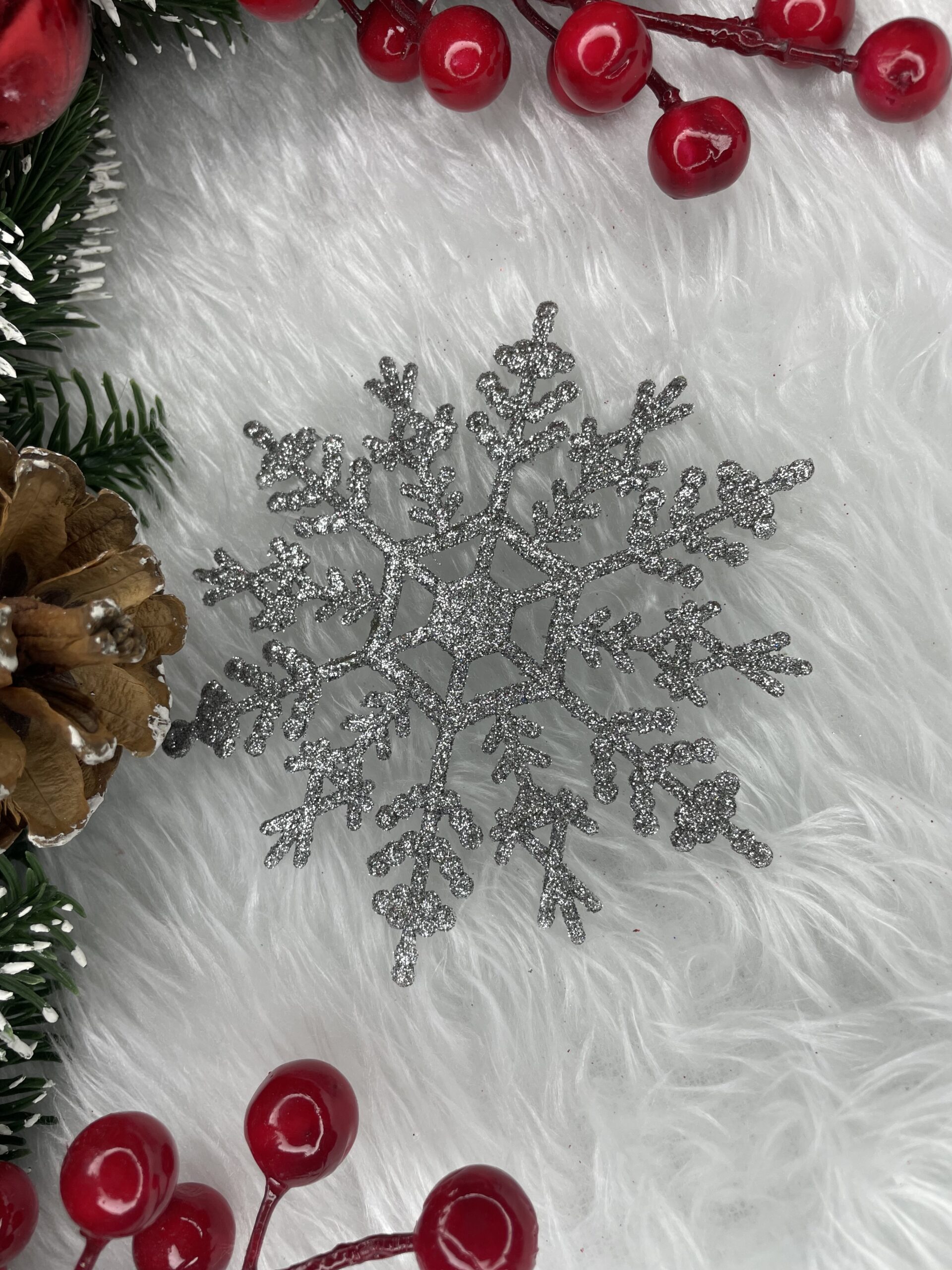 Adauga un plus de farmec sarbatorilor cu acest set de decoratiuni pentru brad in forma de fulg de zapada argintiu. Cu un finisaj stralucitor cu sclipici si un design elegant, aceste ornamente creeaza o atmosfera festiva si luminoasa, fiind perfecte pentru bradul de Craciun, ghirlande sau alte aranjamente sezoniere.