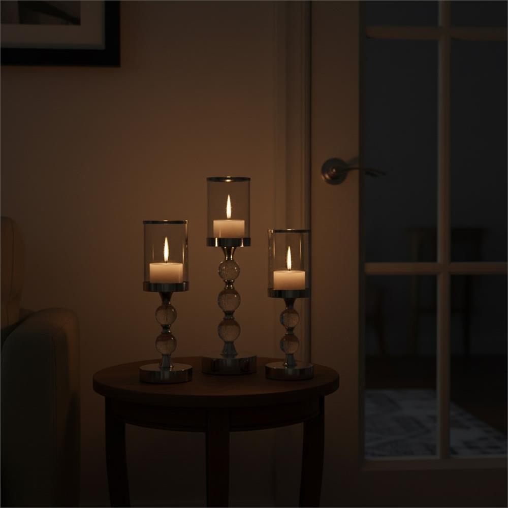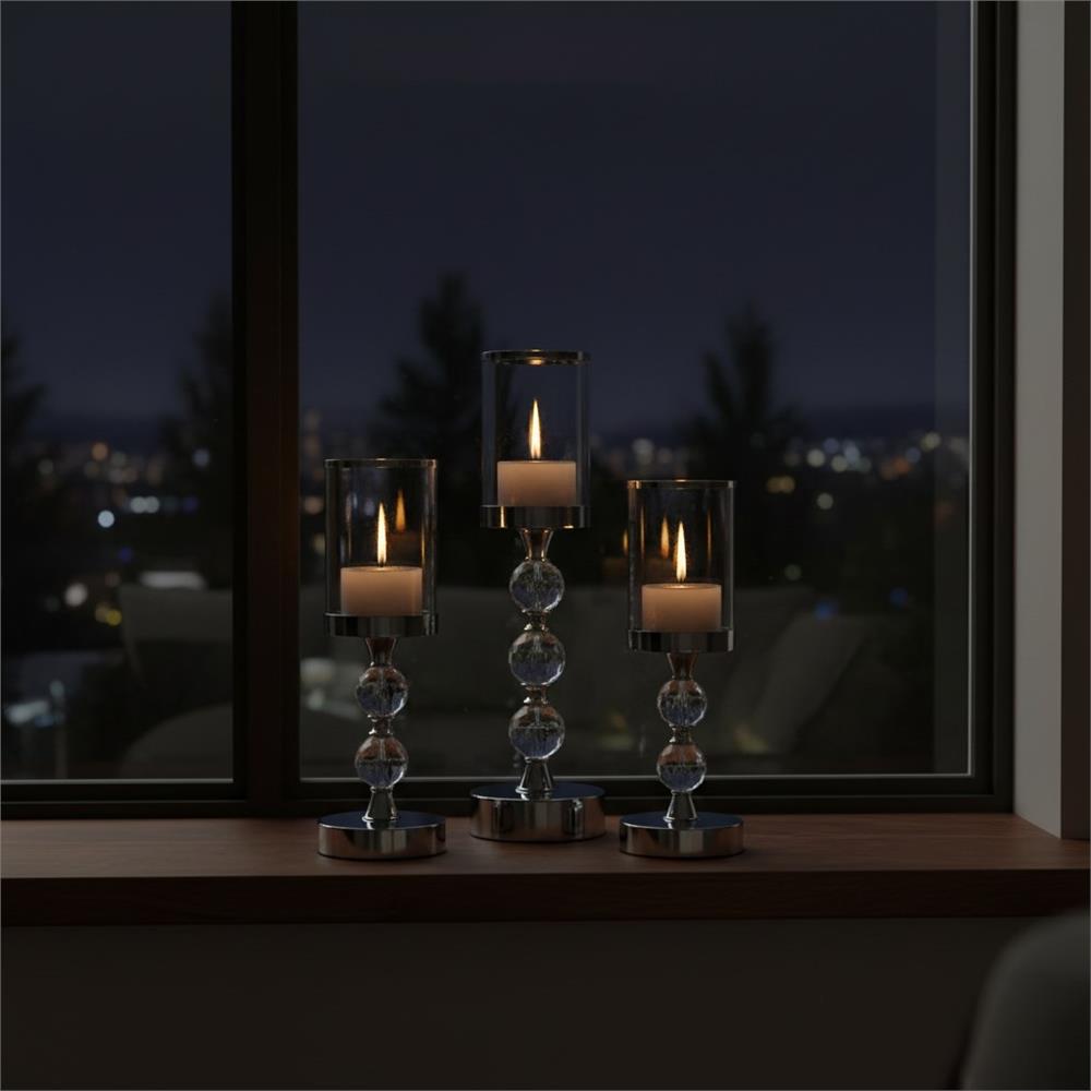 Set 3 sfesnice metalice cu glob cristal si abajur sticla, 28-41 cm, argintiu Household NewTrend