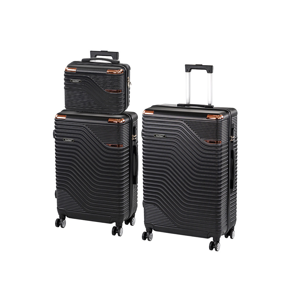 Calatoreste mai usor si mai organizat cu setul de 3 valize Leziter TraveLux Urban XX, in finisaj negru elegant cu accente rose-gold. Carcasa din ABS rezistent la zgarieturi protejeaza eficient bagajele, iar valizele medie si mare se deplaseaza lin datorita rotilor duble 360°, perfecte pentru aeroport, gara sau oras.