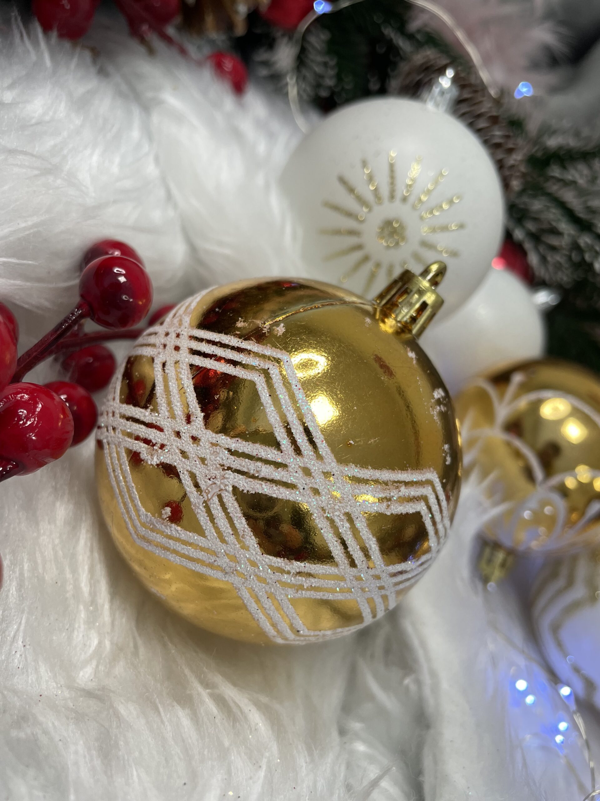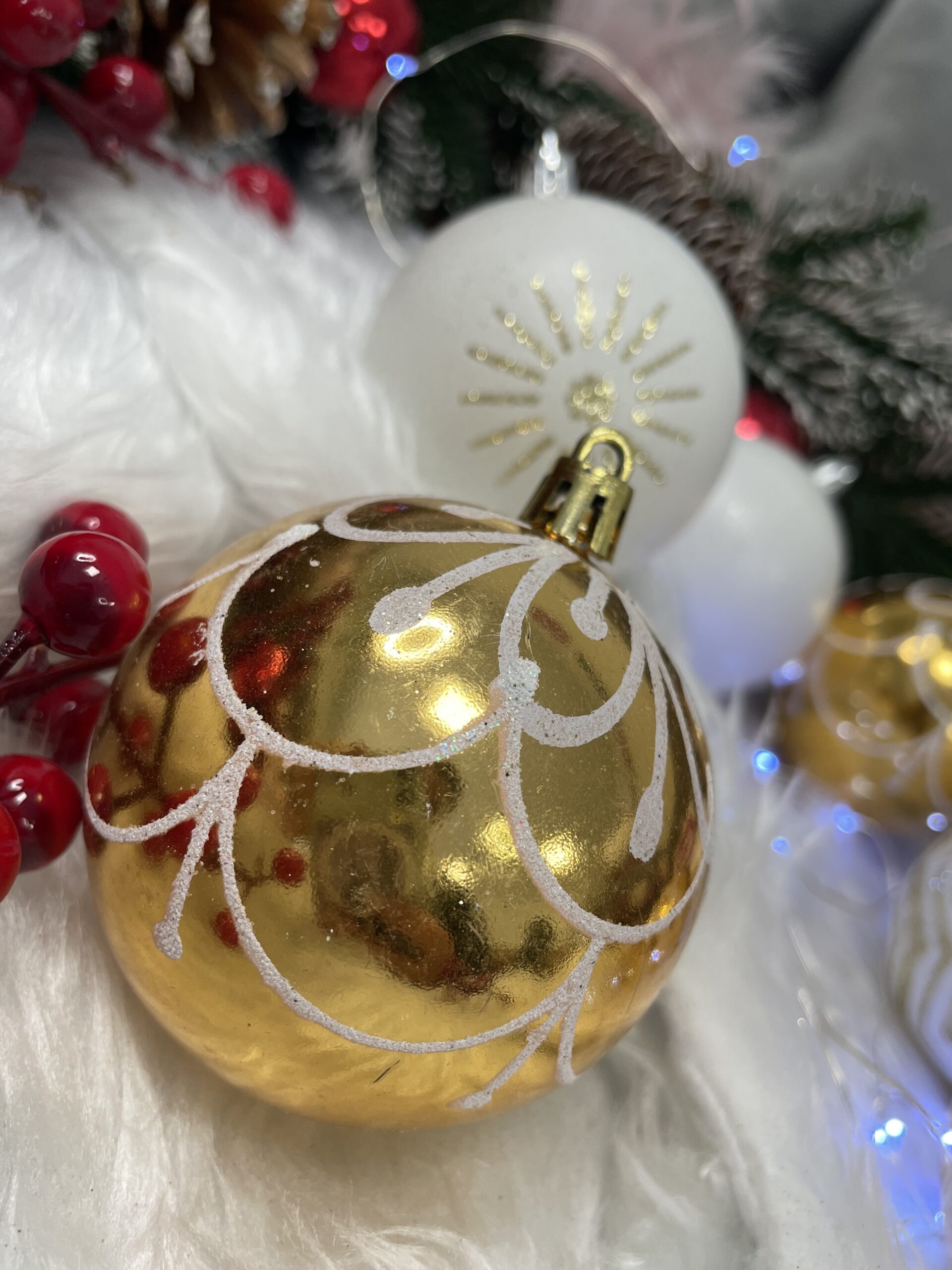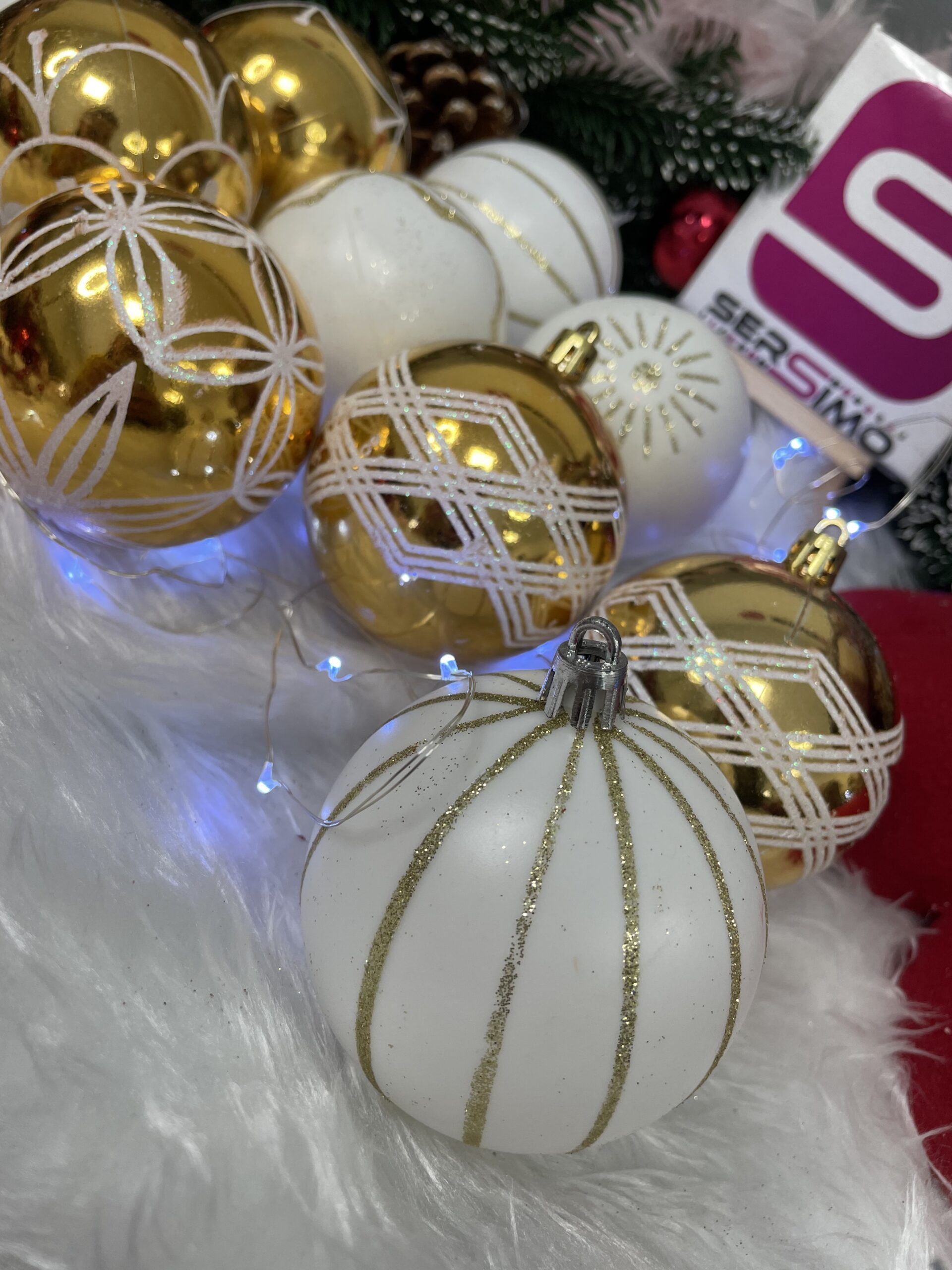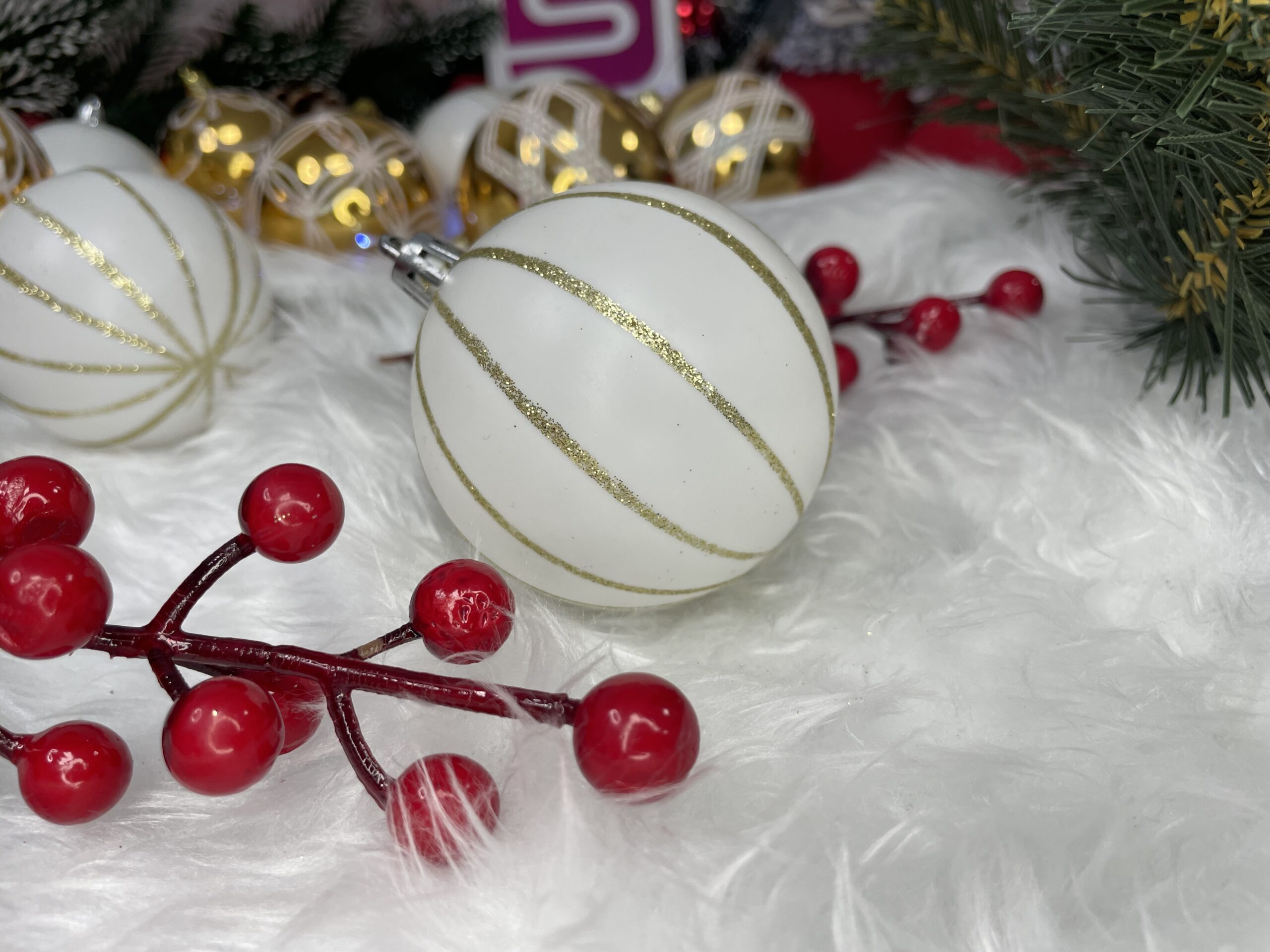 Adauga un plus de eleganta bradului cu acest set de globuri de Craciun in nuante alb auriu, potrivit pentru decoruri clasice, festive sau moderne. Globurile au diametrul de 7 cm si sunt realizate din plastic rezistent, fiind o alegere practica pentru case cu copii sau animale de companie. Finisajele variate creeaza un efect vizual bogat, atat ziua, cat si in lumina instalatiilor de sarbatoare.