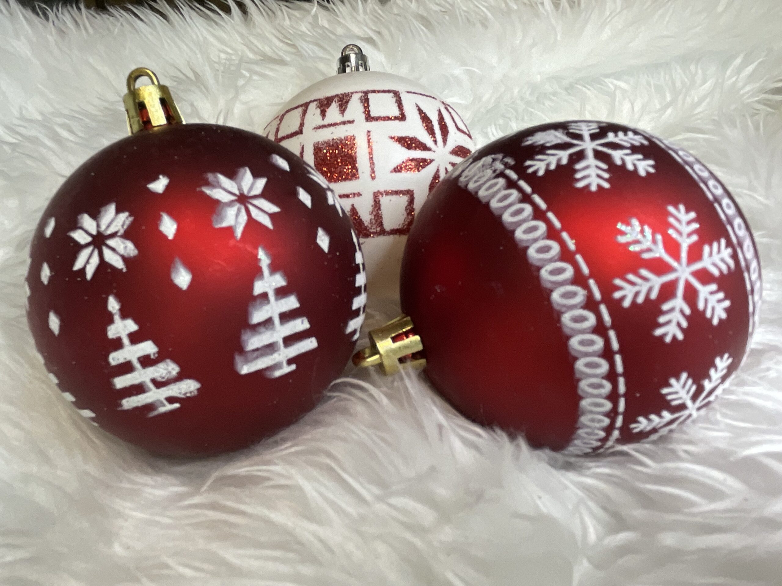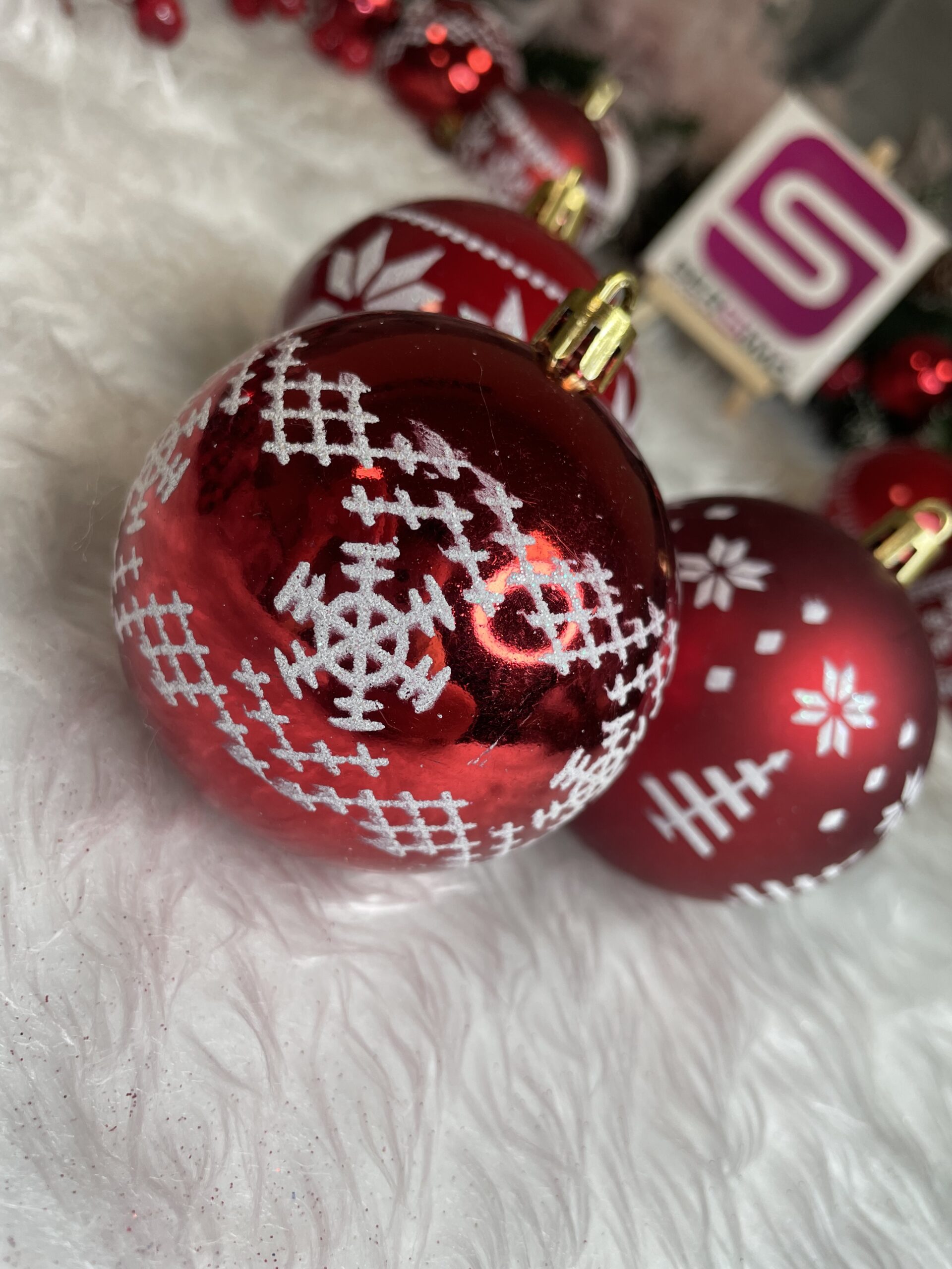 - Continut set: 20 x globuri rosii cu model alb, 10 x globuri albe cu model rosu