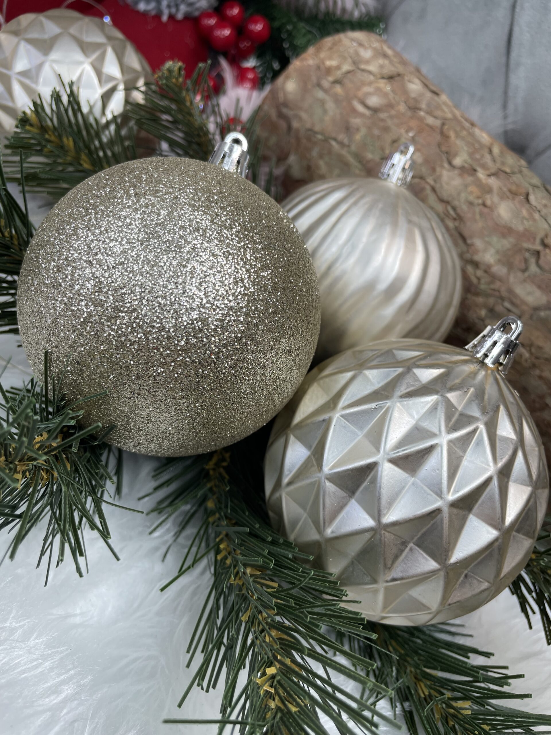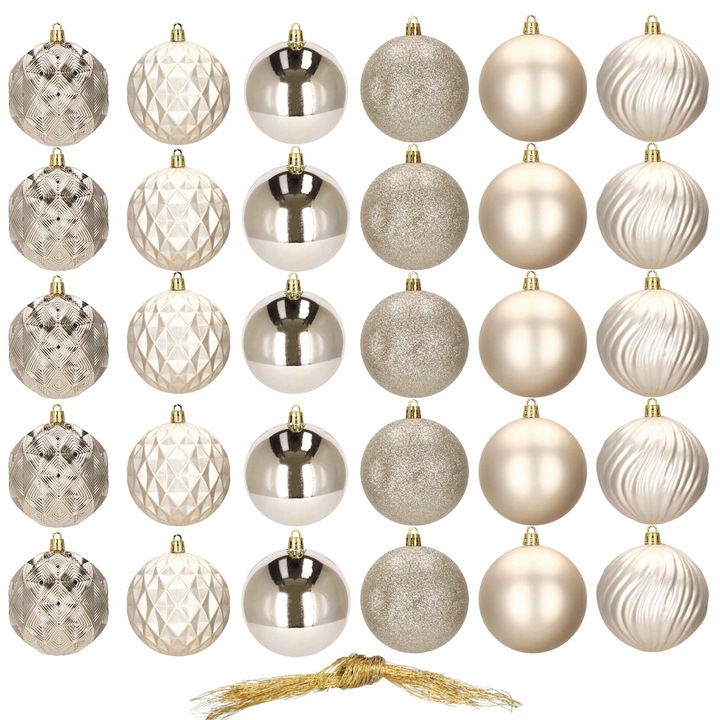 Adauga un plus de eleganta decorului de sarbatoare cu acest set de globuri de Craciun aurii, ideal pentru brad, aranjamente festive si decoratiuni interioare. Cele 30 de globuri au un aspect rafinat, in 6 modele diferite, cu finisaje mate, lucioase, texturate si cu sclipici, pentru un efect vizual bogat si armonios. Fiind realizate din plastic incasabil, sunt o alegere practica si sigura pentru familiile cu copii sau animale de companie.