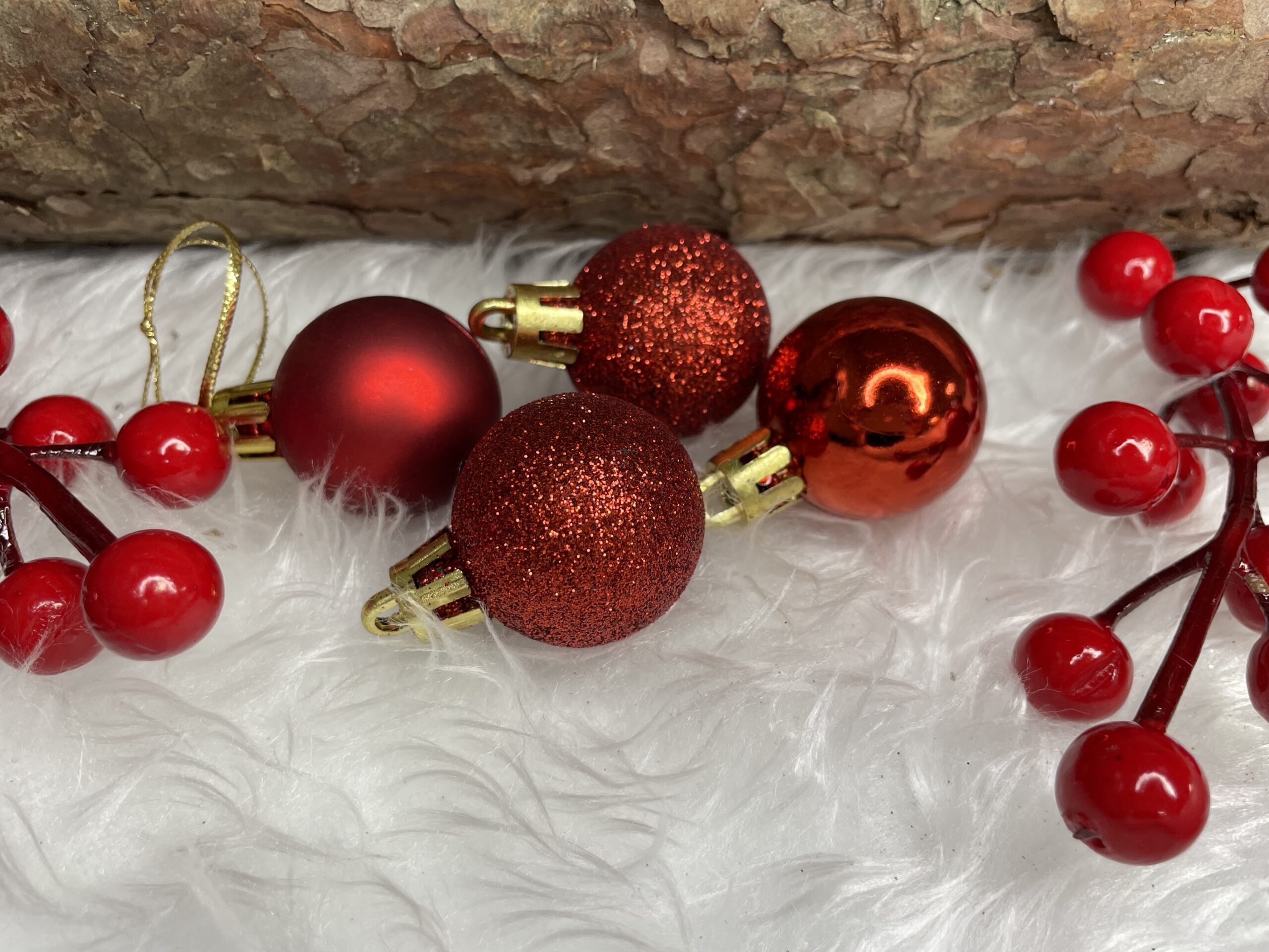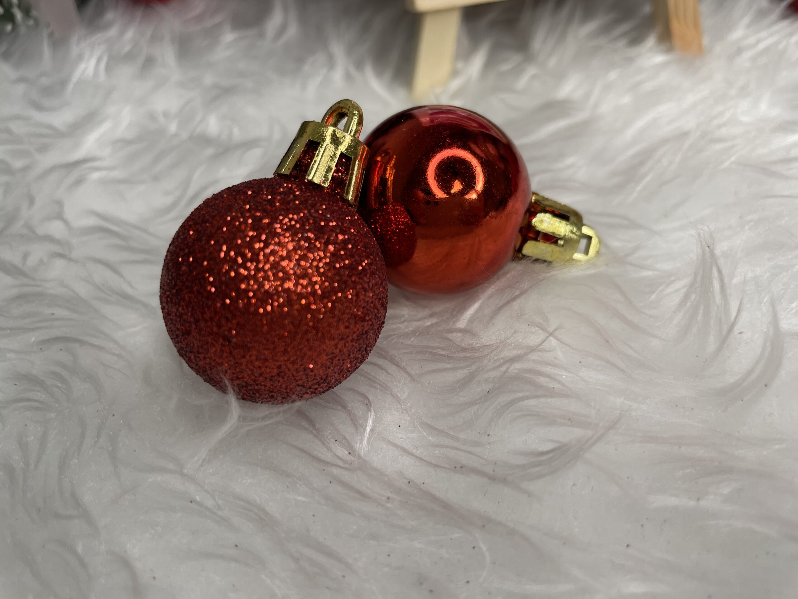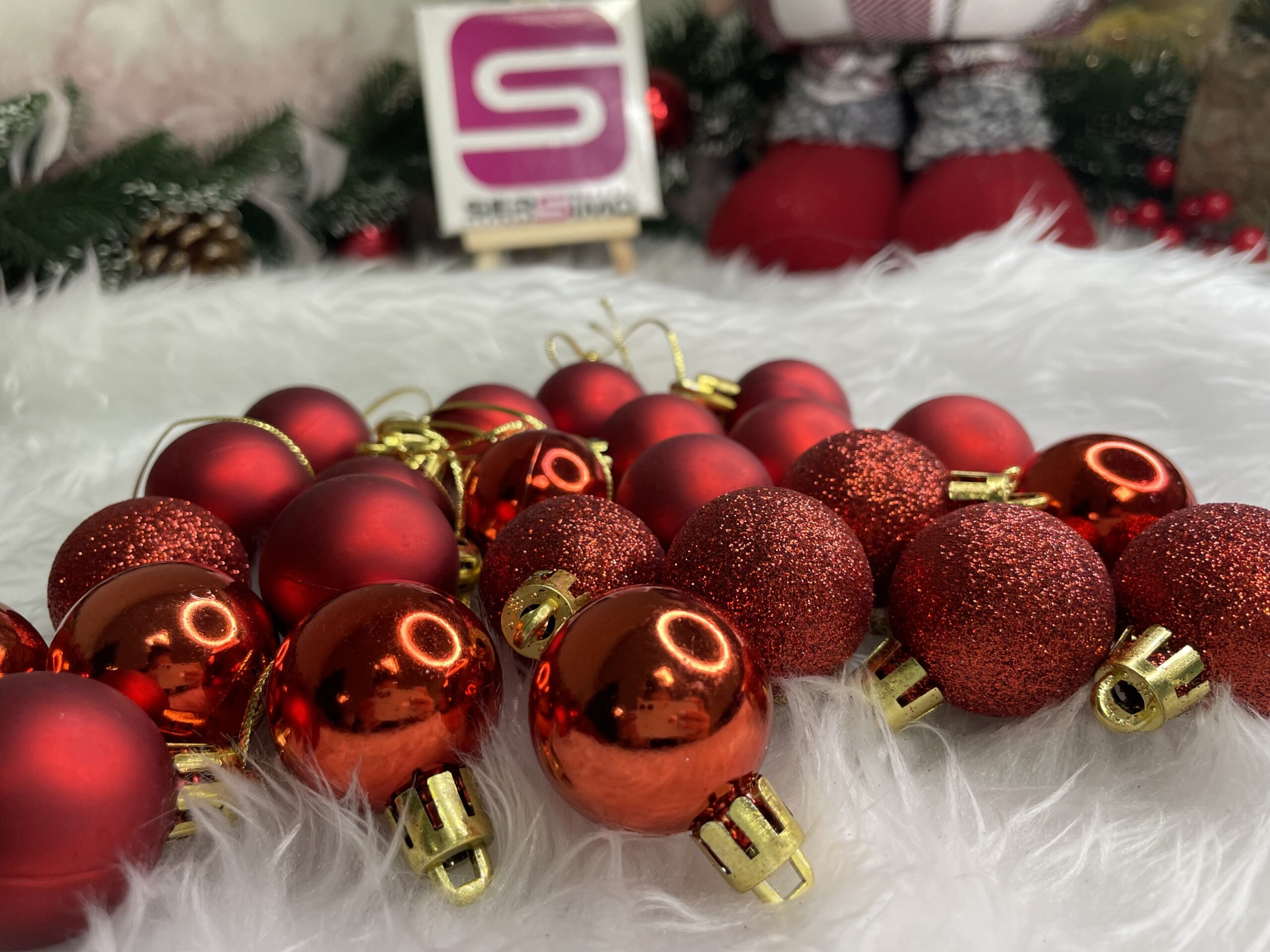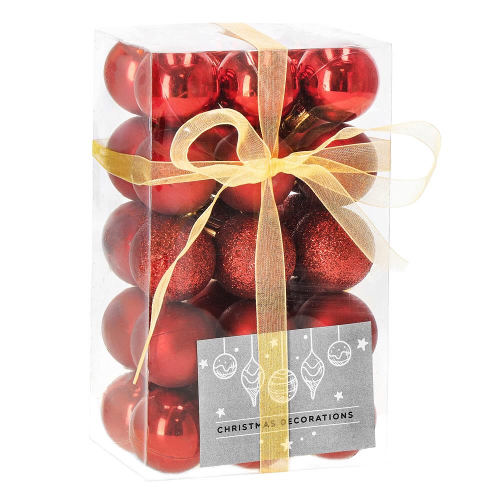 Set 30 globuri de Craciun rosii, 3 modele, 3 cm, incasabile