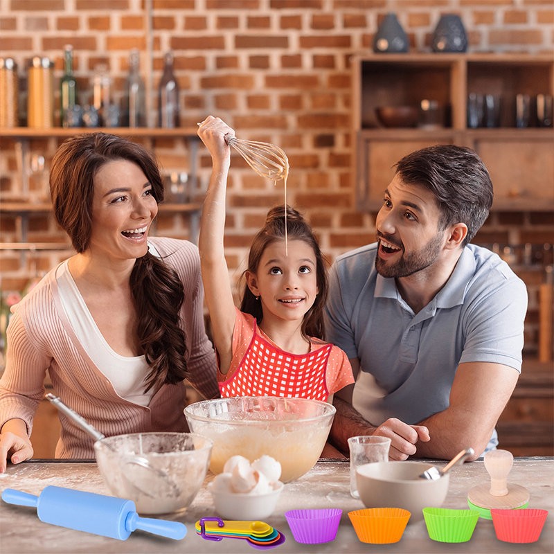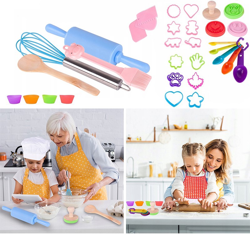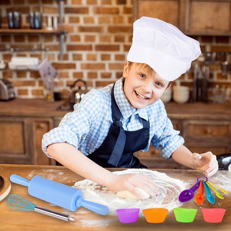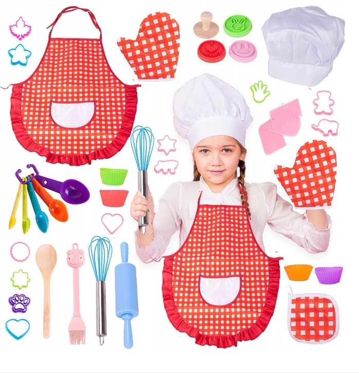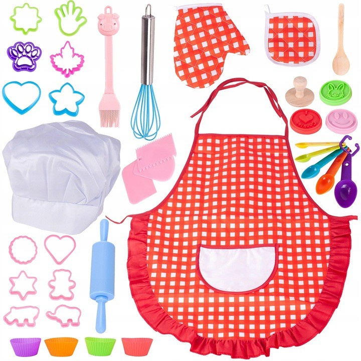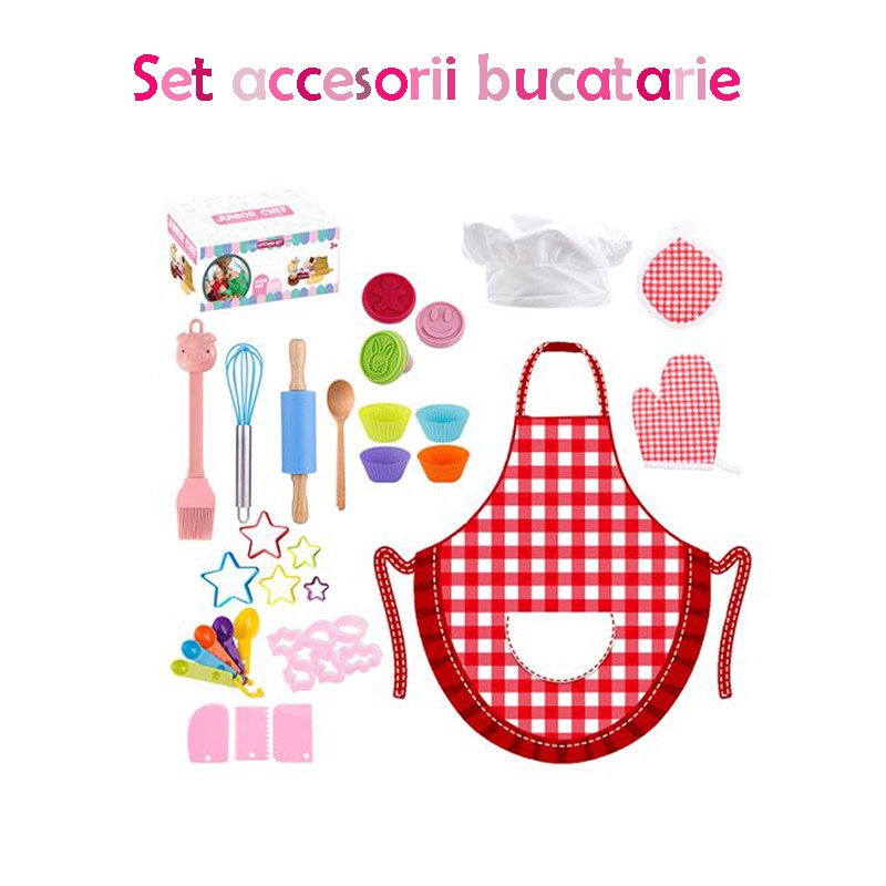 Setul de 39 de accesorii este perfect pentru micii pasionati de gatit si cofetarie, oferindu-le tot ce au nevoie pentru a se juca si a invata sa pregateasca deserturi delicioase. Acest set cuprinzator include diverse accesorii de cofetarie, precum un sucitor, multiple forme pentru prajituri, tel de amestecare, spatula, linguri, ustensile de decorare, dar si echipamente, cum ar fi sortul, manusa si boneta de bucatar, pentru o experienta autentica de mini chef.