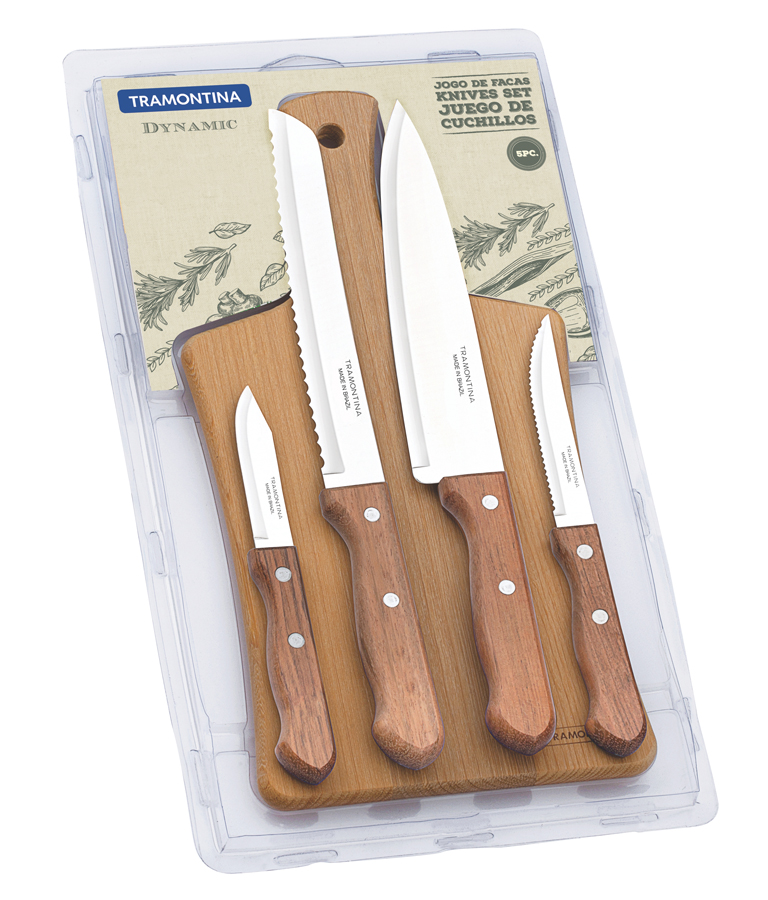 Set 4 cutite gama DYNAMIC (cutit pentru legume, cutit pentru friptura, cutit feliat paine, cutit bucatar) fabricate din inox de foarte buna calitate, isi mentin stralucirea dupa o utilizare indelungata, maner din lemn natural de Jatoba (cires brazilian) , foarte rezistent la impact si coroziune, ideal pentru utilizare zilnica + tocator din lemn, ambalat in blister.
