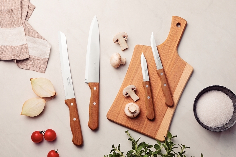 Cu manere din lemn natural atasate cu nituri din aluminiu, vesela Dynamic adauga o nota rustica meselor dumneavoastra.