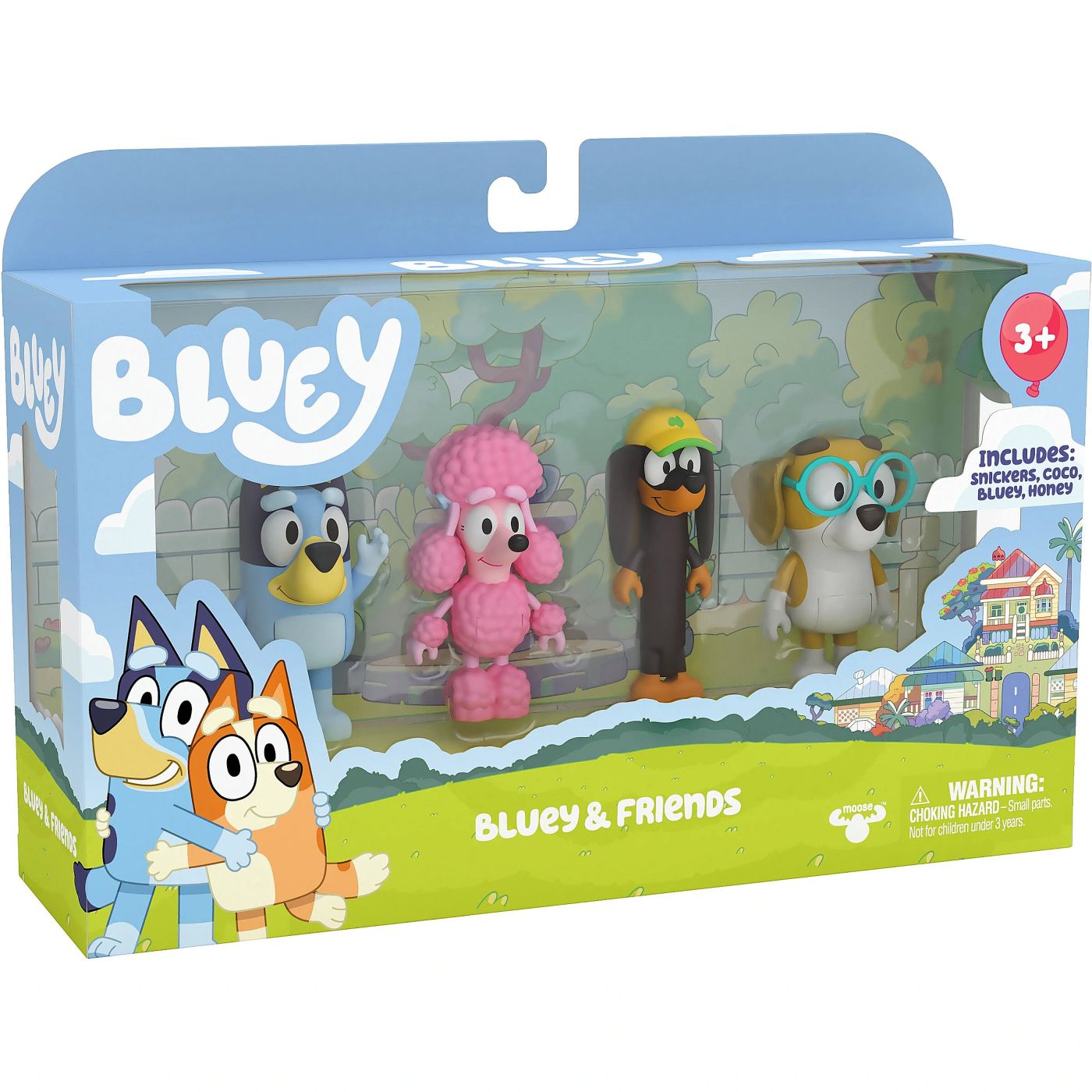 Bluey este un caine albastru de sase ani caruia ii place sa se joace. Capul ei nu este plin de altceva decat de idei interesante! Împreuna cu sora lui mai mica, Bingo traieste multe aventuri amuzante. Friends este un set de patru figurine de caini, care este format din Bluey, Snickers, Coco si Honey. Lasa casa sa rasune de sunetele vesele ale rautatii copiilor! Figurile de basm cu parti mobile ale corpului sunt perfecte pentru jocul creativ. Ele ofera prescolarilor posibilitatea de a recrea povesti cunoscute din animatii sau de a crea noi aventuri Bluey.