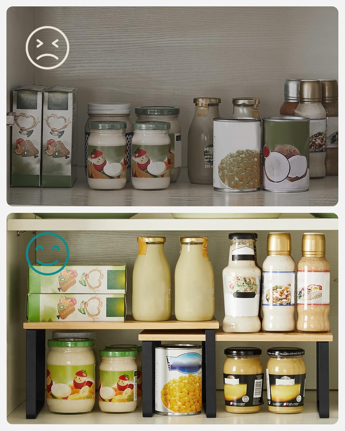 Utilizare: așază rafturile pe blatul de bucătărie pentru a avea la îndemână condimentele și cănile preferate sau folosește-le în dulap pentru a crea niveluri suplimentare de depozitare. Sunt excelente și pentru organizarea cămării ori a spațiilor mici unde fiecare centimetru contează.