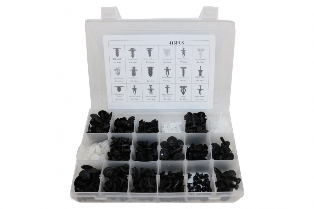 1 x 415 bucati elemente de fixare mixte 1 Levier pentru extractie cleme si bumbi Cutia contine doar clipsurile prezentate in imagini, alte tipuri de clipsuri nu sunt incluse.