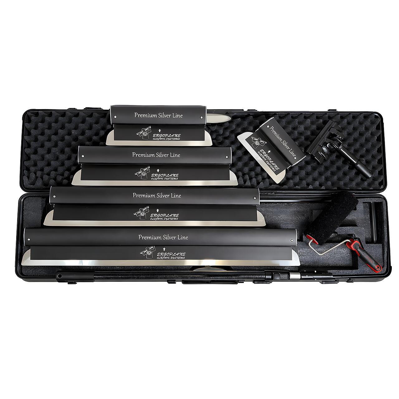 Set 5 gletiere profesionale, lama inox 0.4 mm, Premium Silver, 25, 40, 60, 80, 100 cm, adaptor, maner telescopic, rola gletuit, geanta, Ergoplane, Olejnik