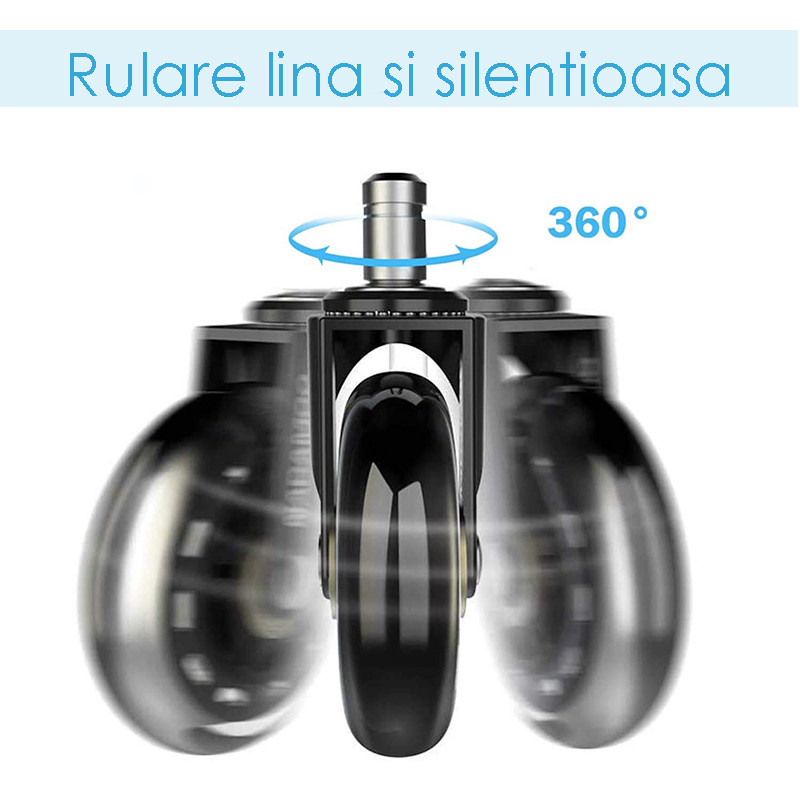 Imbunatateste rapid mobilitatea scaunului tau cu acest set de 5 roti pentru scaun de birou, concepute pentru rulare silentioasa si confort la fiecare miscare. Datorita combinatiei de silicon si cauciuc, rotile aluneca usor si ajuta la protejarea pardoselii (parchet, gresie, marmura sau laminat), fara sa fie nevoie de covoras de protectie.