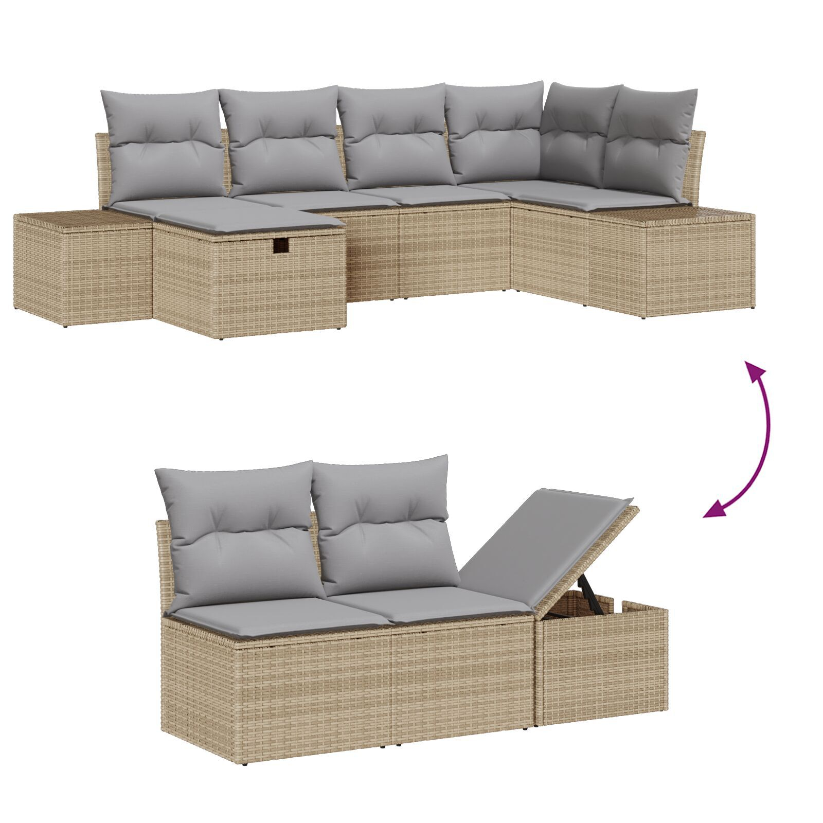 - Funcții de Stocare: Fiecare piesă are stocare ascunsă cu un sac impermeabil, ideal pentru a păstra pernele sau obiecte personale când nu este folosit. Menține-ți spațiul outdoor ordonat.